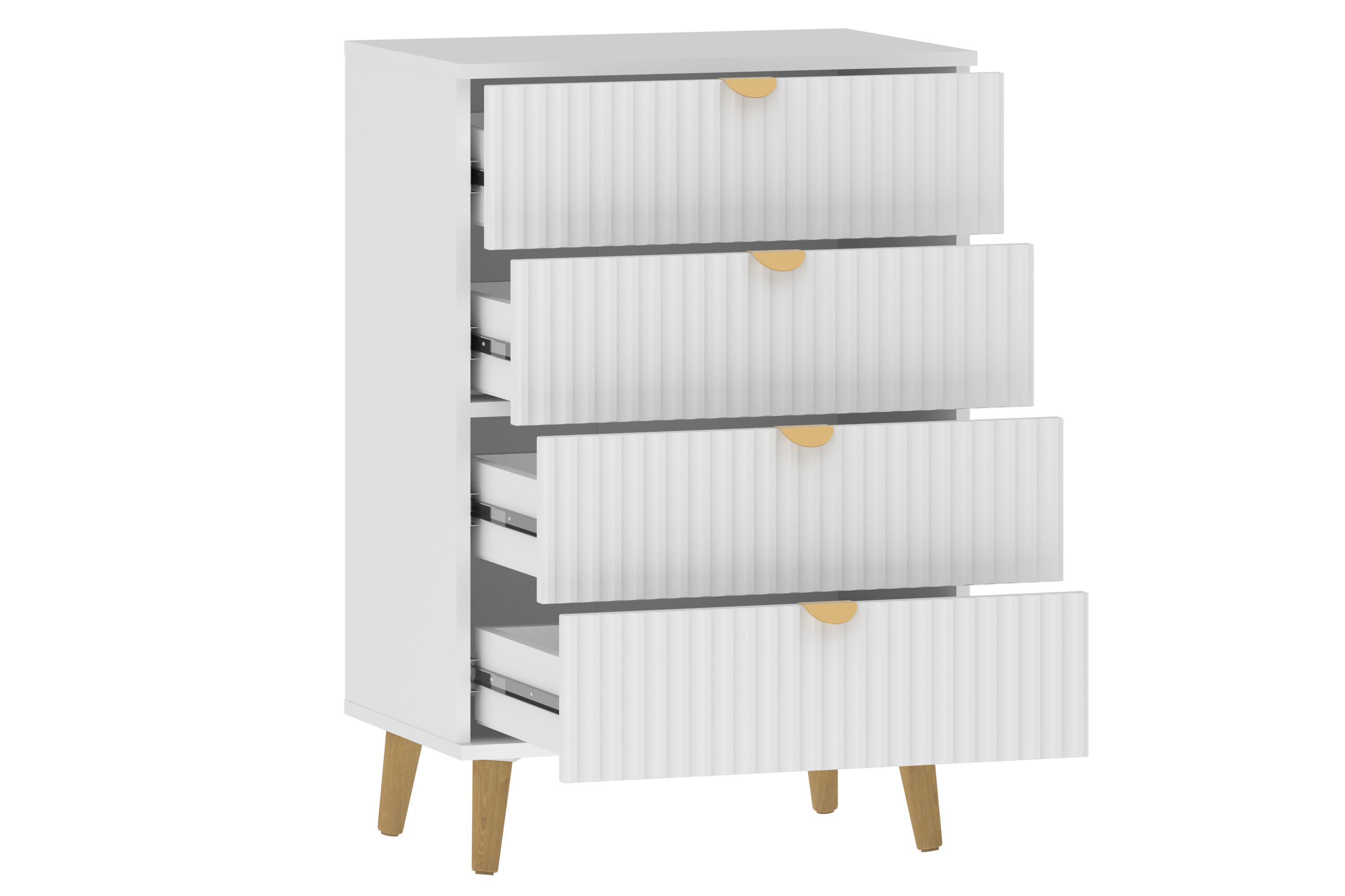 Комод оснащен четырьмя выдвижными ящиками, которые открываются плавно и бесшумно благодаря шариковым направляющим, а высокие опоры облегчают процесс уборки.