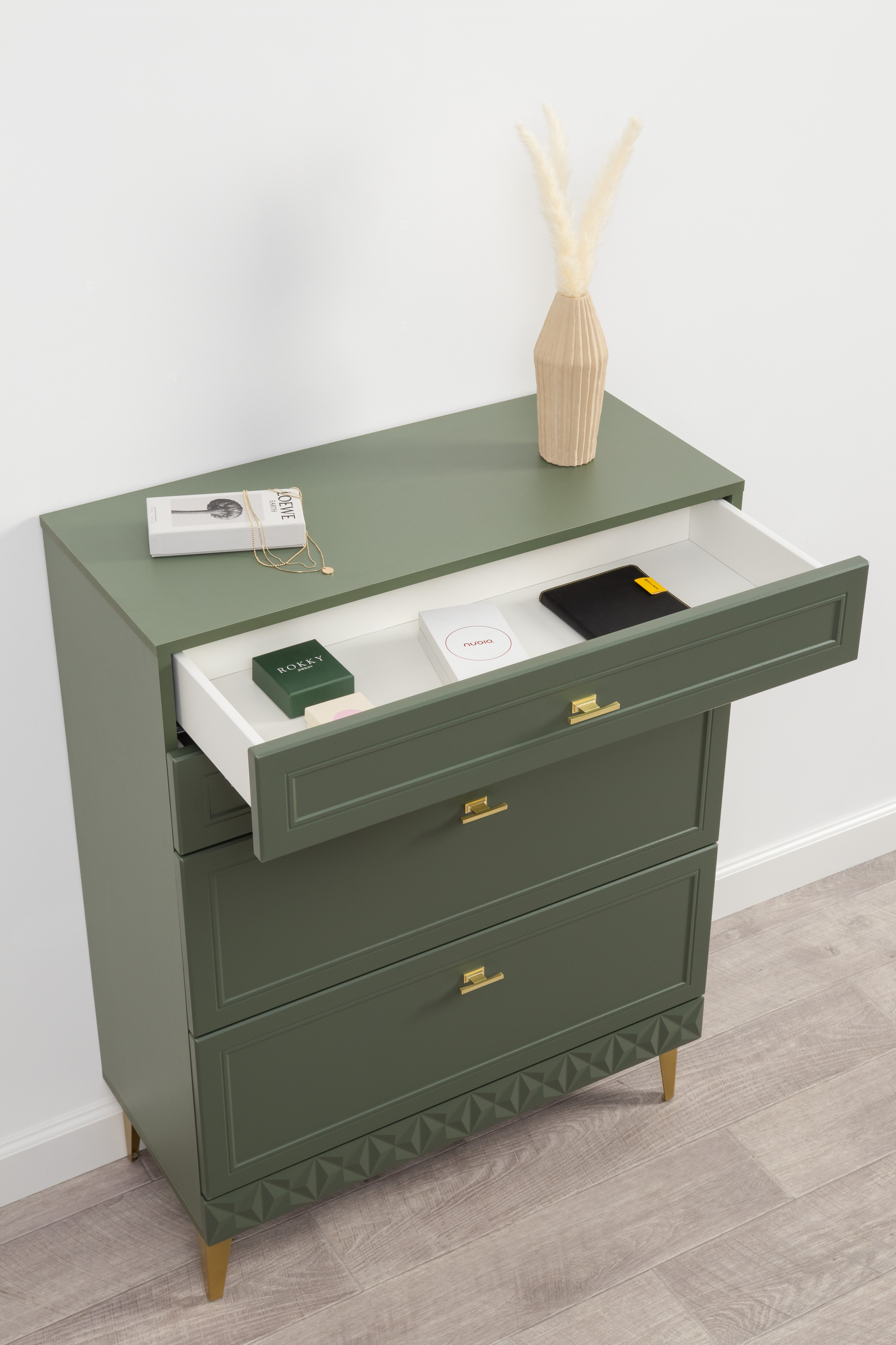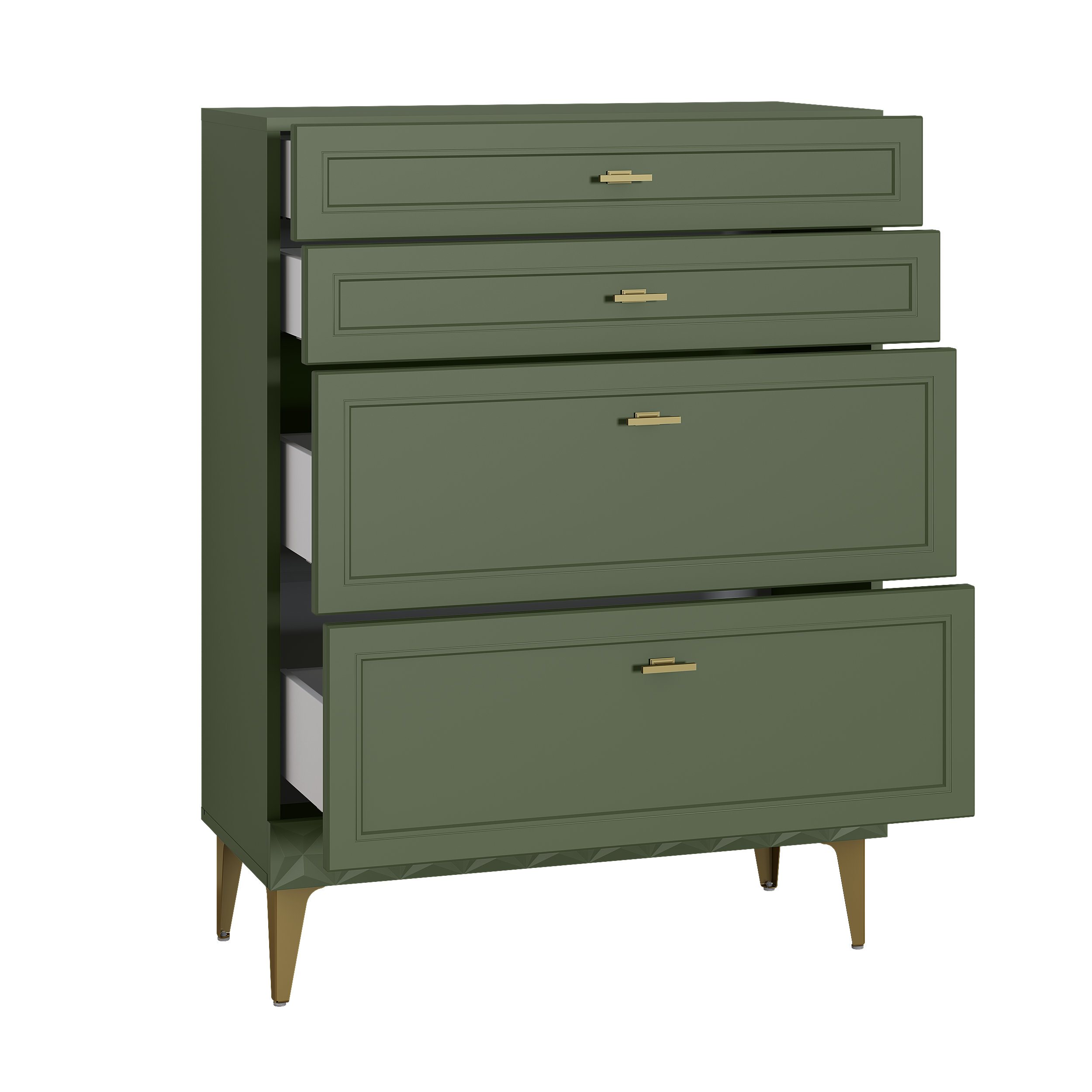Комод Марион 16.249 дымчатый зеленый K521, олива шагрень AG 1050 ПВХ, белый PE шагрень