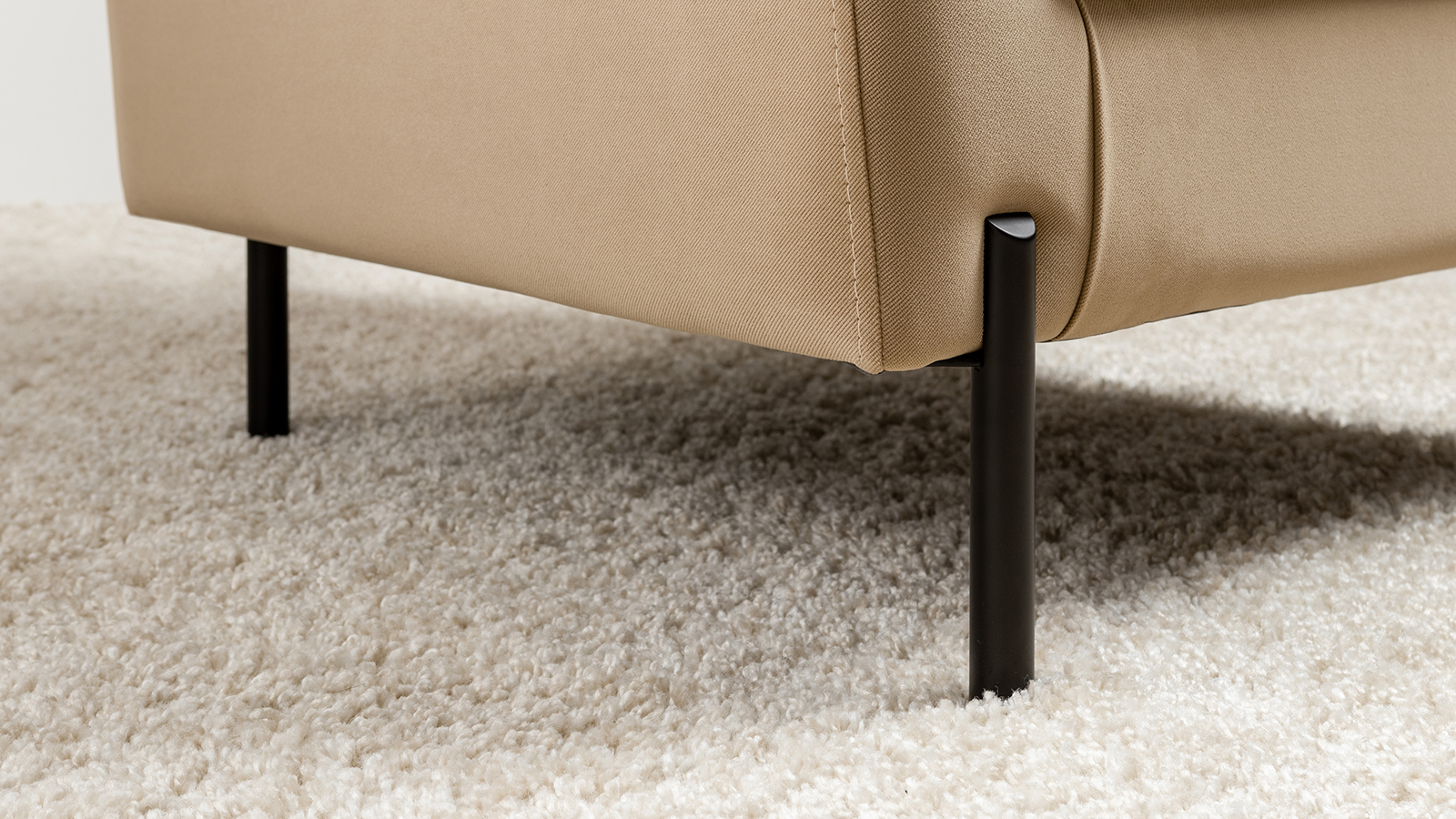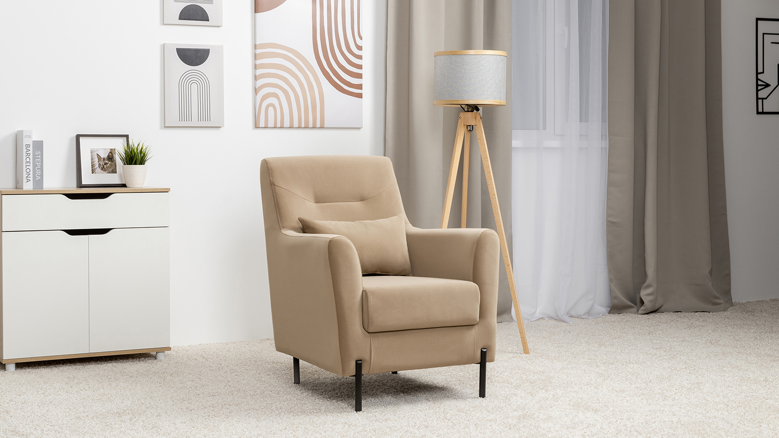 Декоративная утяжка на спинке кресла, декоративная подушка в цвете кресла, металлические опоры переходят в декоративный элемент подлокотника