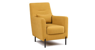 Декоративная утяжка на спинке кресла, декоративная подушка в цвете кресла, металлические опоры переходят в декоративный элемент подлокотника