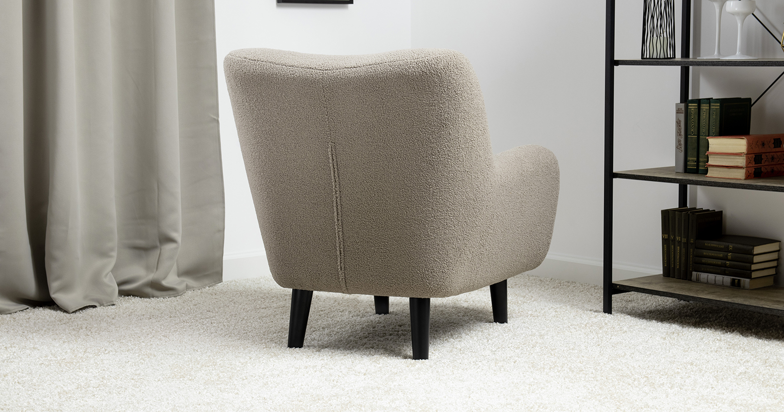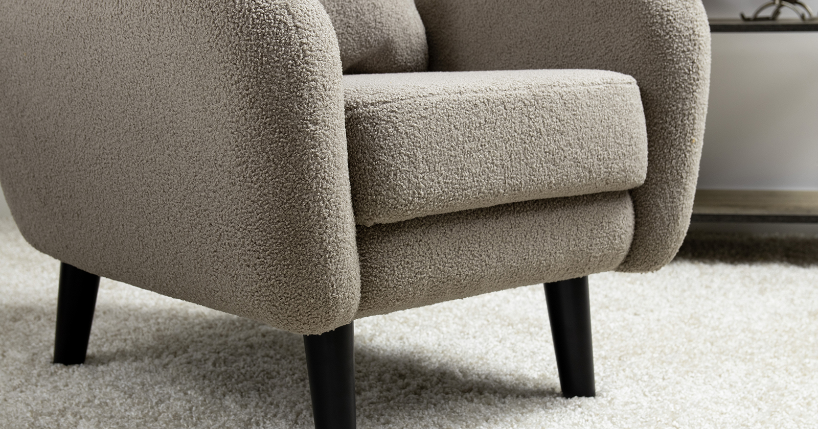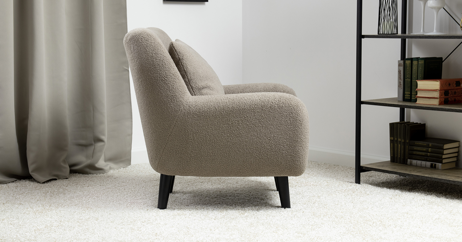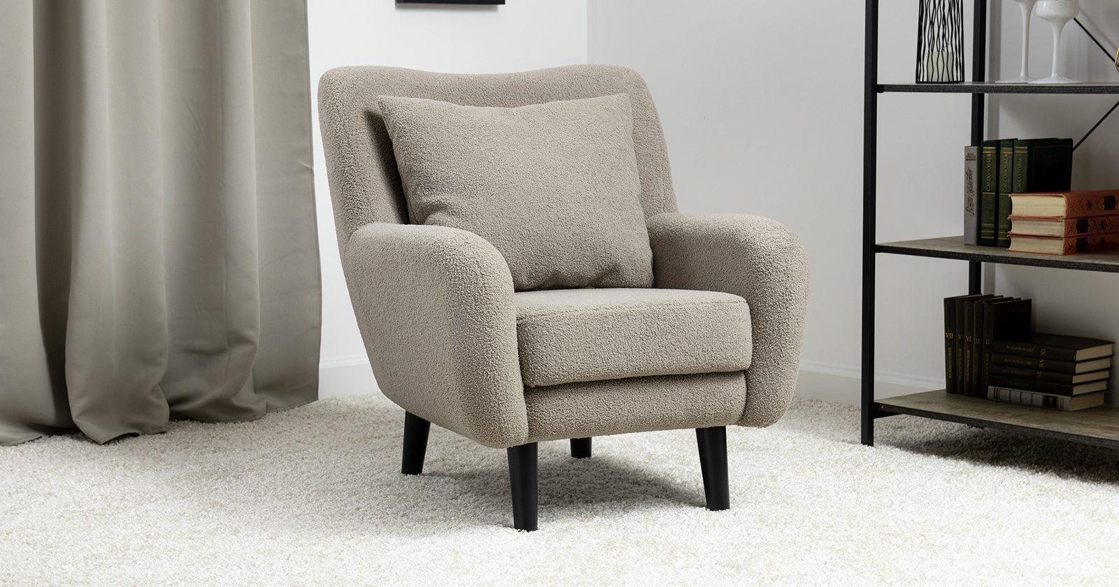 Ткань букле делает кресло особенно уютным и мягким. Приспинная подушка в цвете кресла