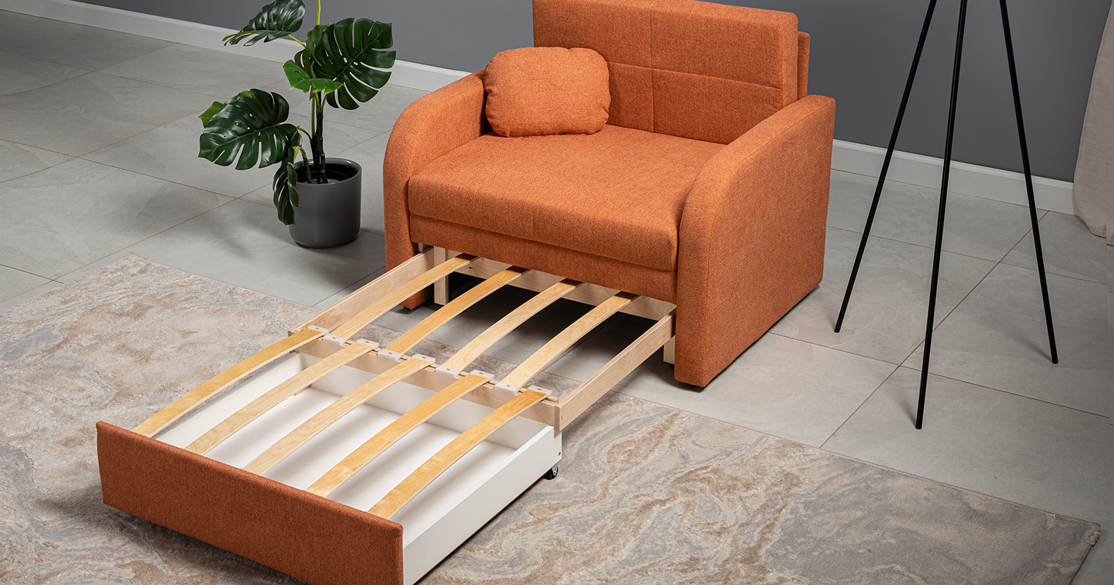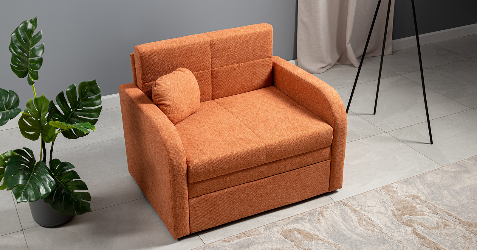 Коллекция выполнена в современном минималистичном стиле с мягкой обивкой из износостойкой ткани и декоративной стежкой, подчеркивающей геометрию форм. Механизм трансформации обеспечивает дополнительное спальное место, делая мебель не только эстетичной, но и максимально функциональной для небольших пространств.