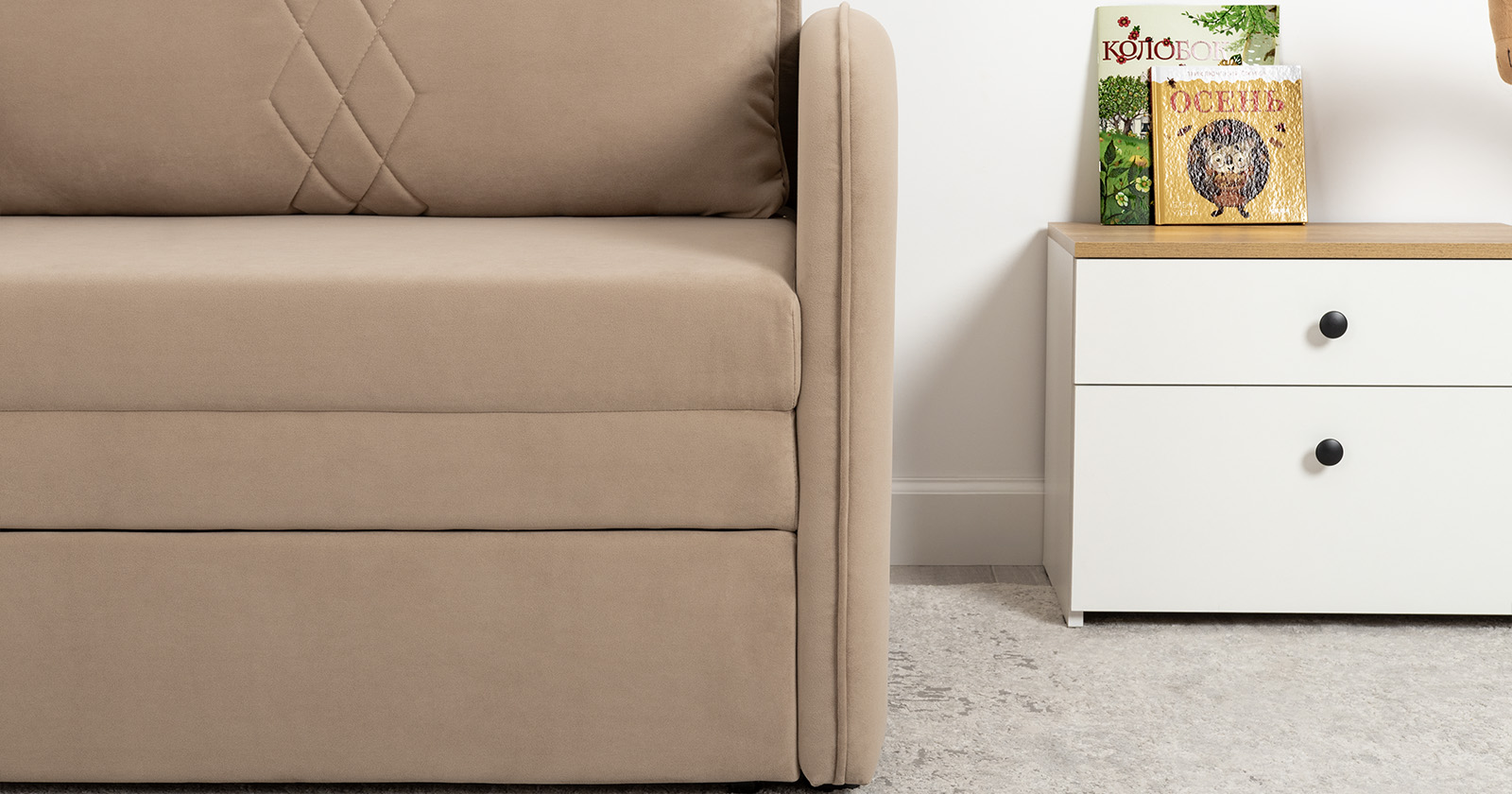 Стильный компактный диван для детской и гостиной. При своих скромных размерах он трансформируется в полноценное спальное место для детей и подростков. Лаконичный дизайн в виде декоративной стежки подчеркивает фактуру велюра, а небольшие размеры позволят разместить его в любом пространстве.