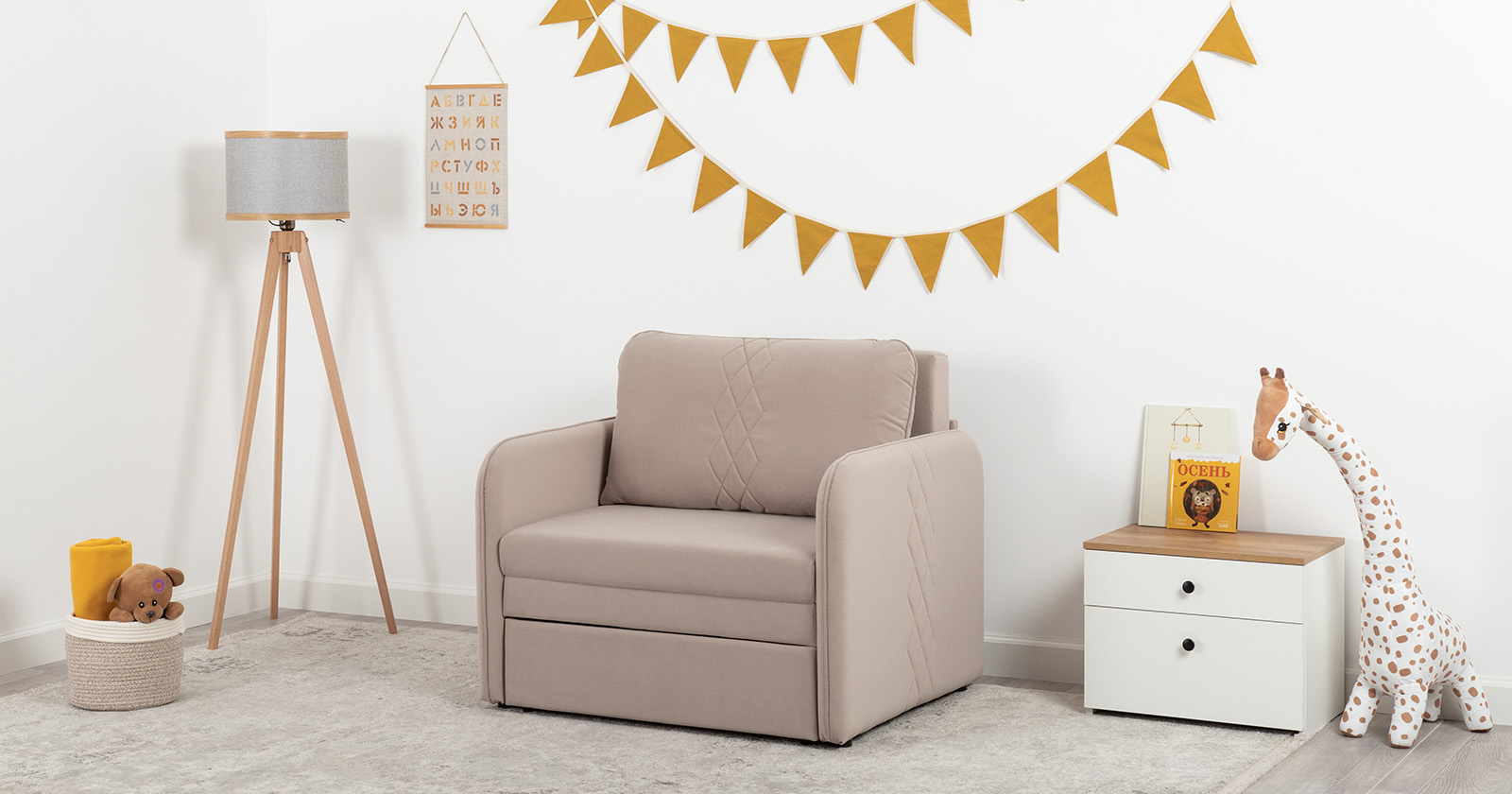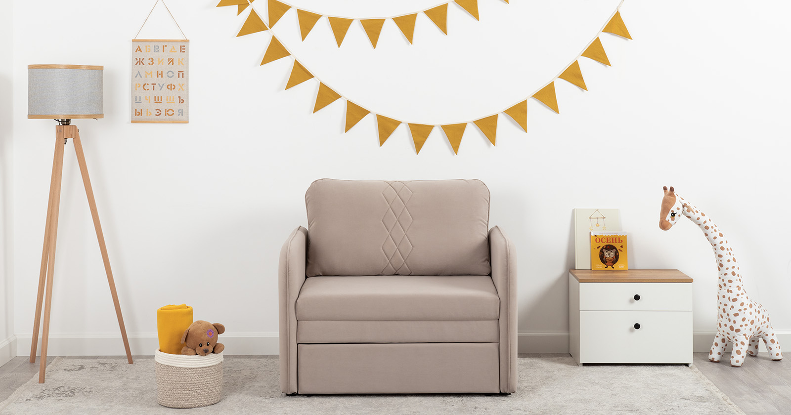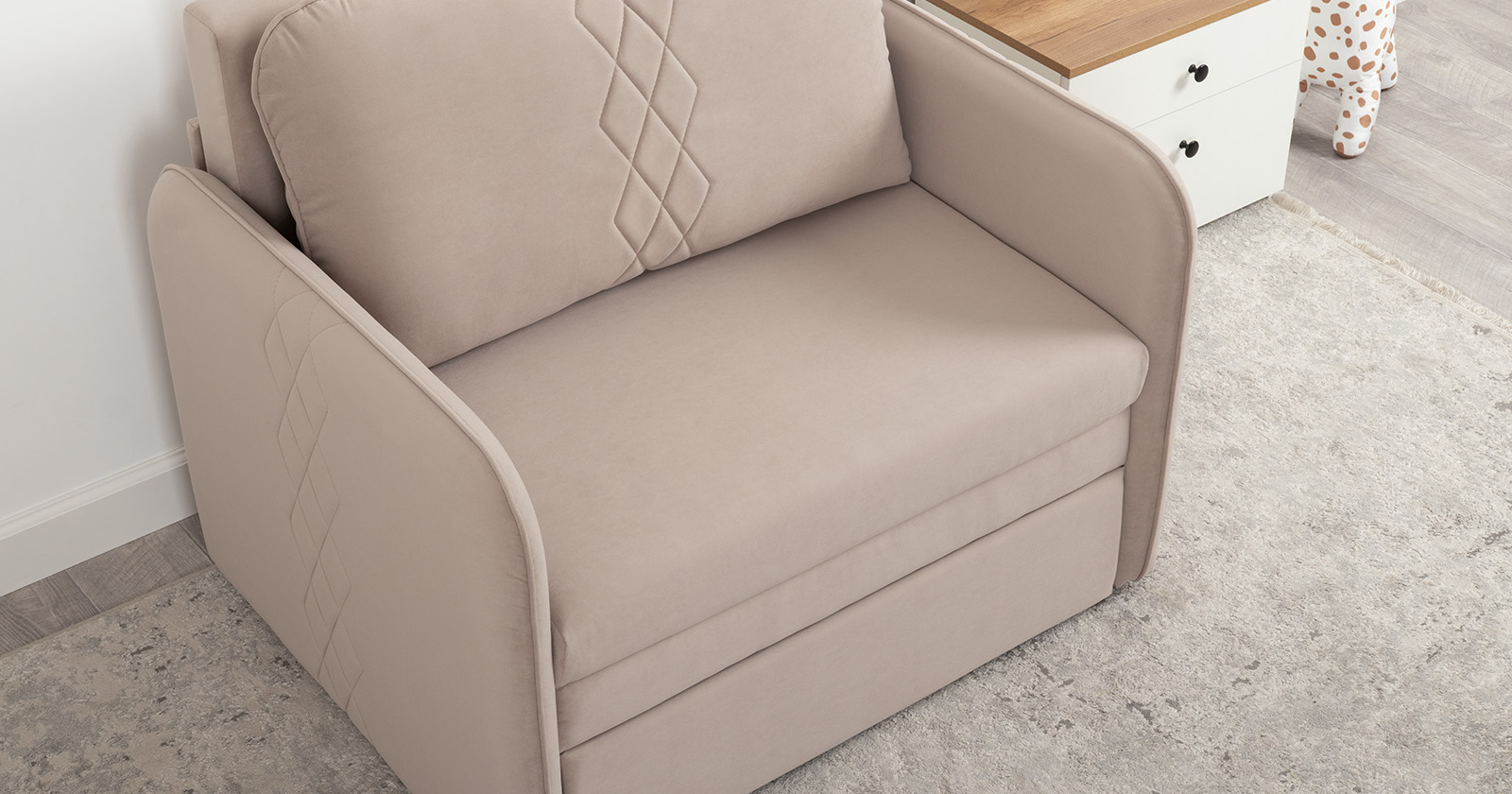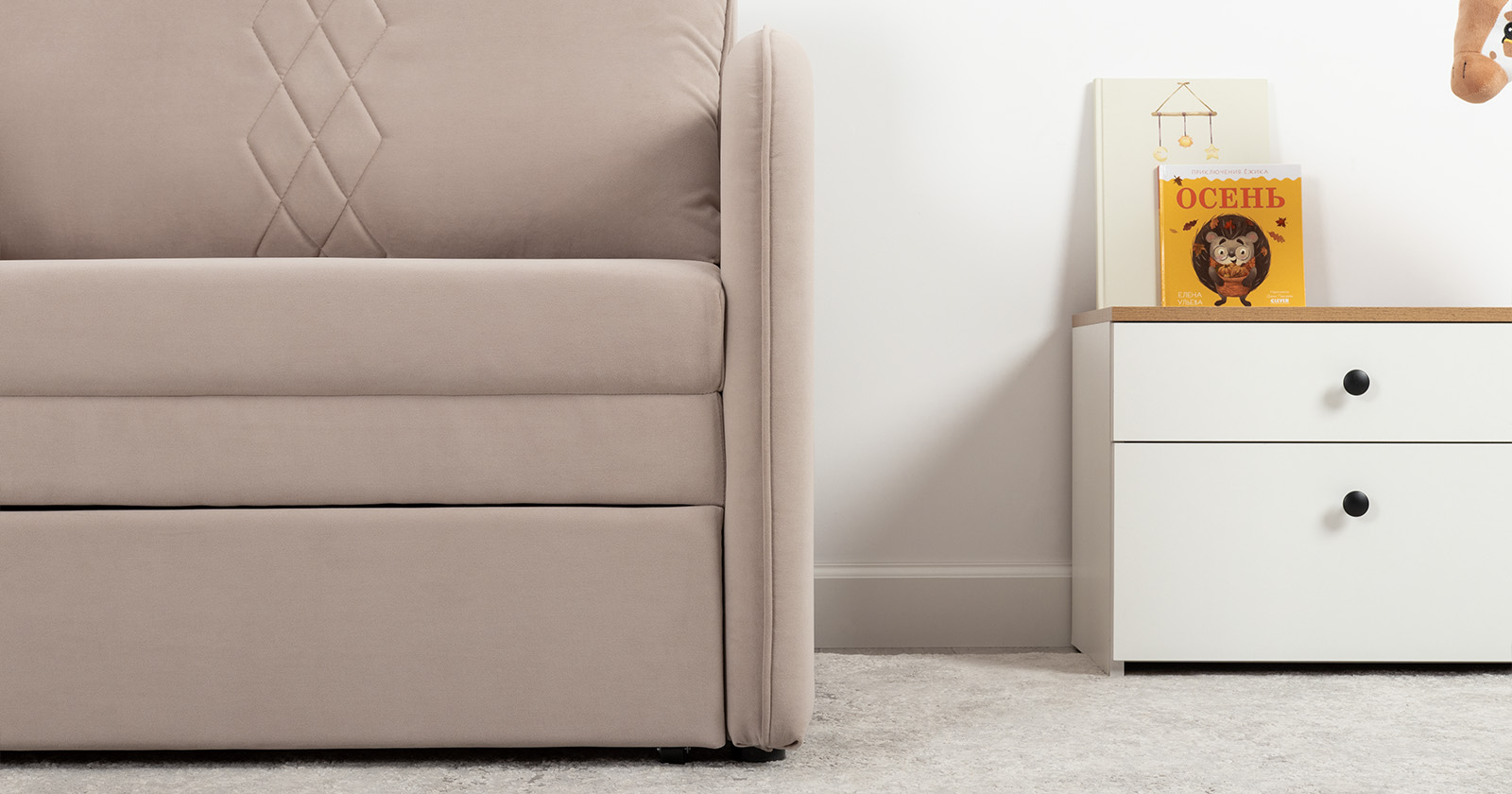 Стильный компактный диван для детской и гостиной. При своих скромных размерах он трансформируется в полноценное спальное место для детей и подростков. Лаконичный дизайн в виде декоративной стежки подчеркивает фактуру велюра, а небольшие размеры позволят разместить его в любом пространстве.