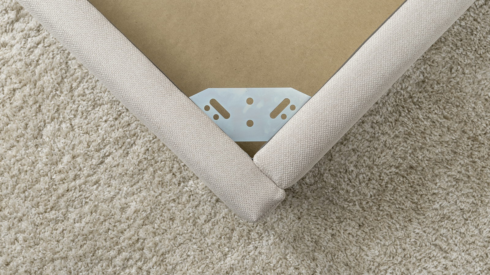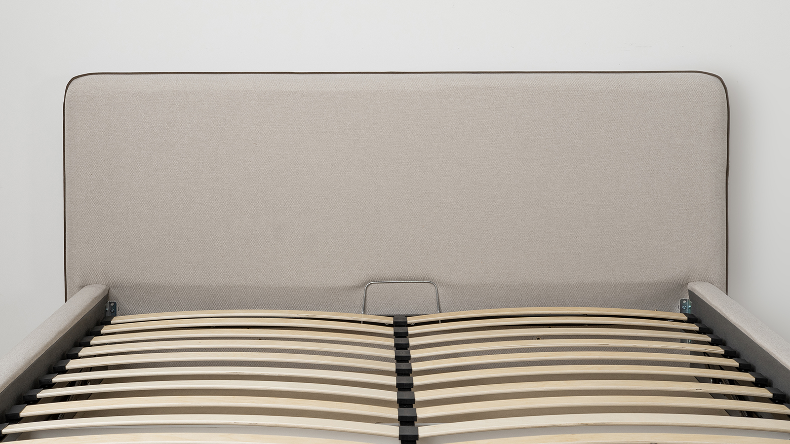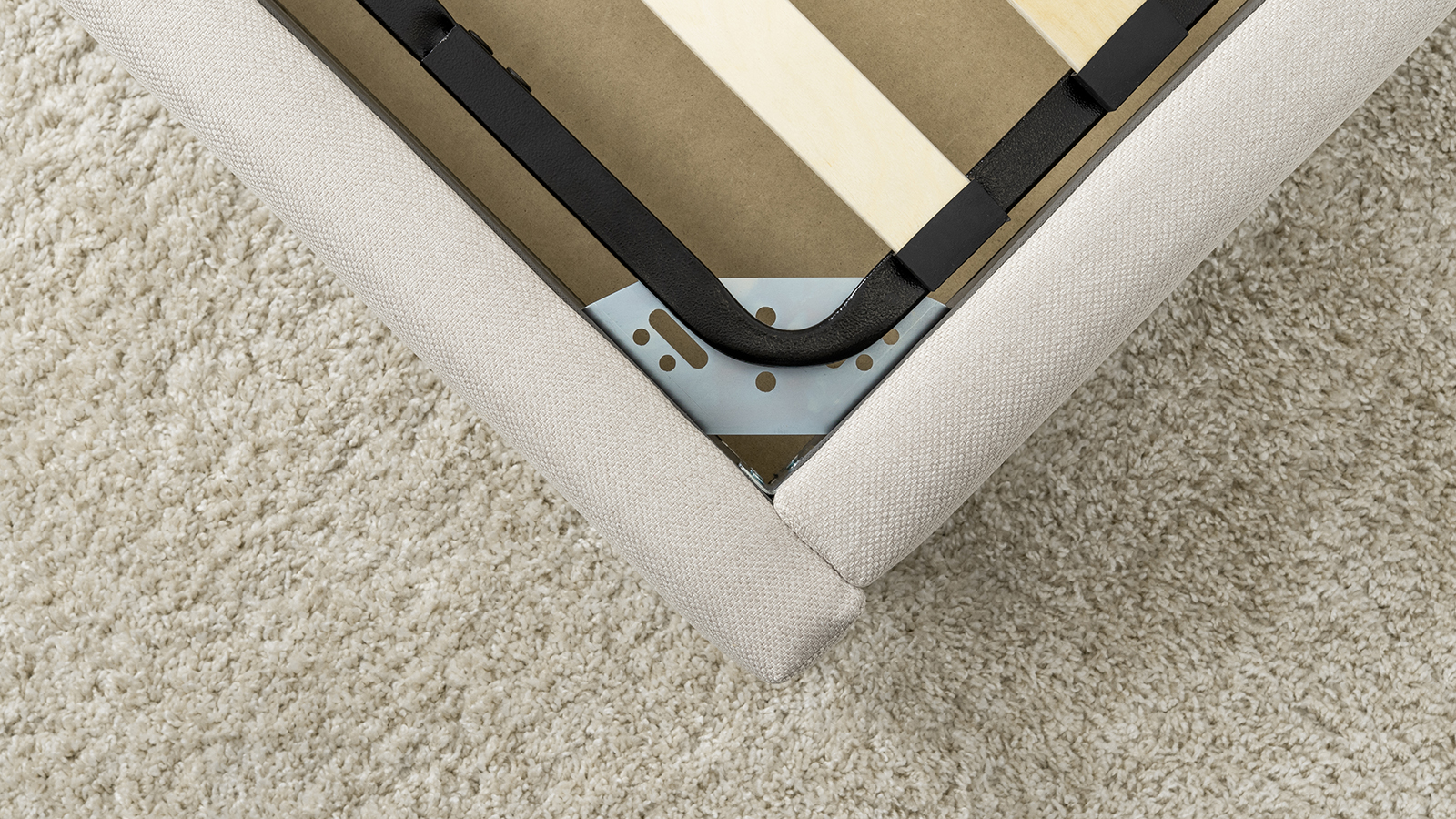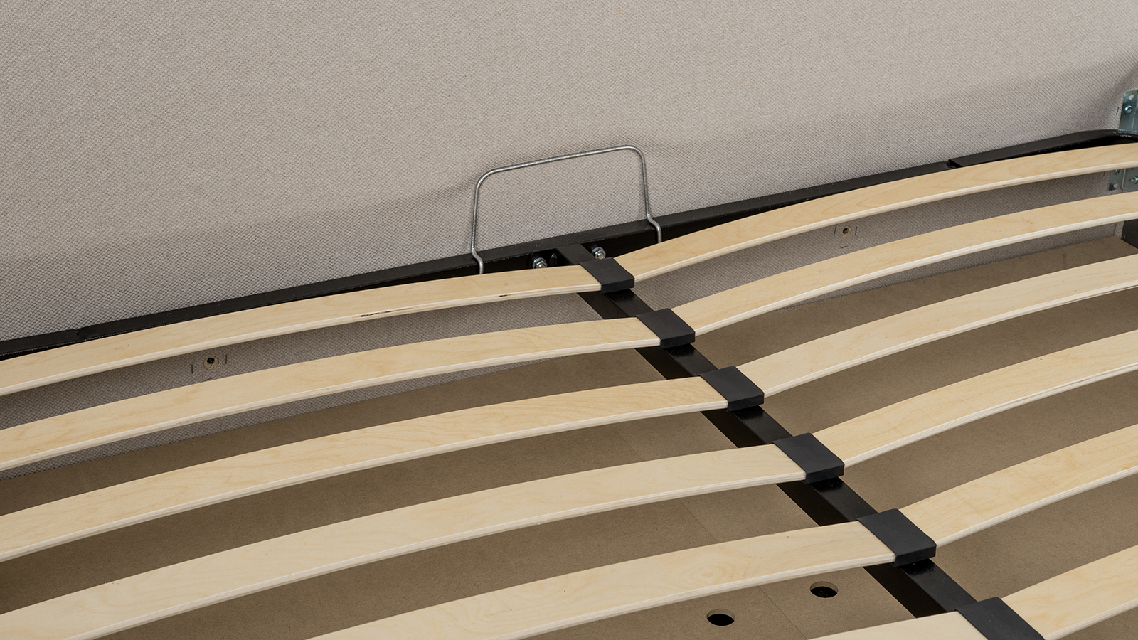 Основание кровати укомплектовано матрасодержателями. Жесткое кроватное дно из МДФ 6 мм. Задняя стенка изголовья выполнена в тех. ткани (спанбонд).