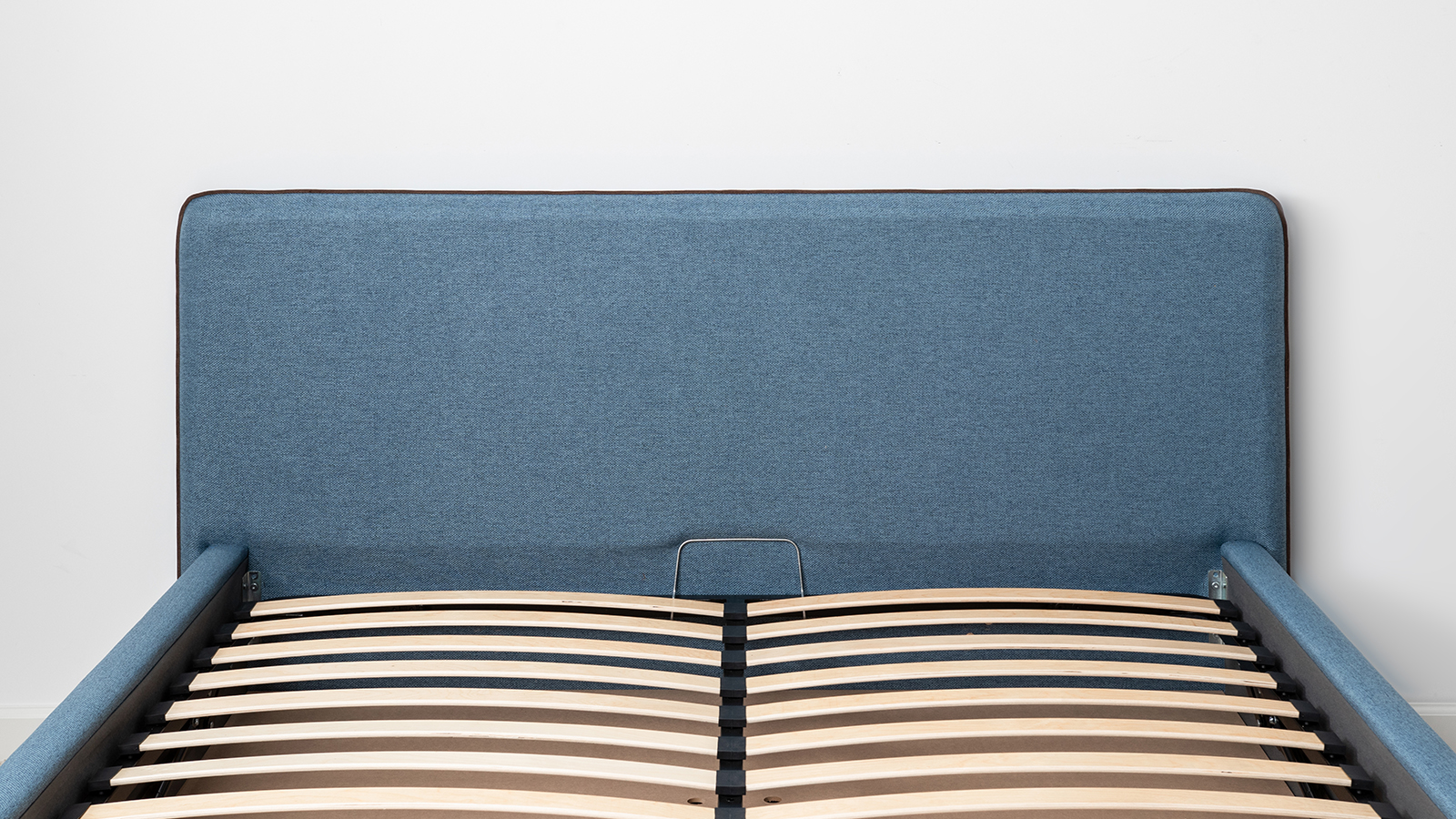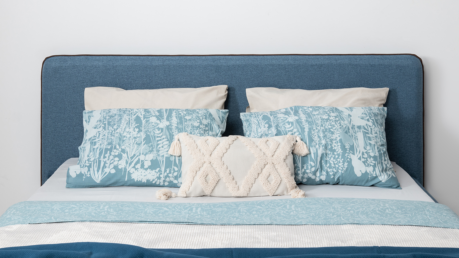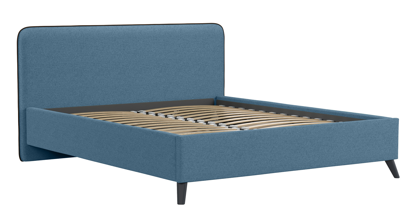 Cкругленный торец изголовья оформлен контрастным кантом.