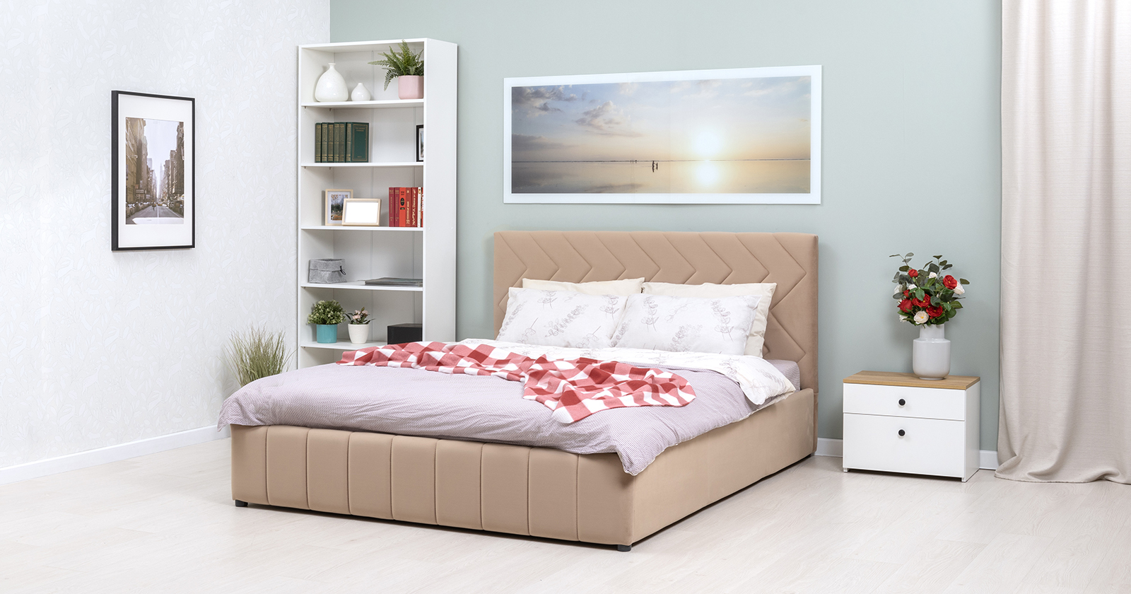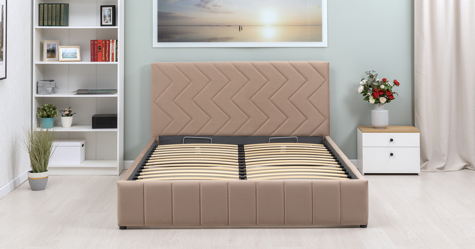 Кровать Милана 160 велюр бежевый кофейный с ортопедическим основанием и подъемным механизмом