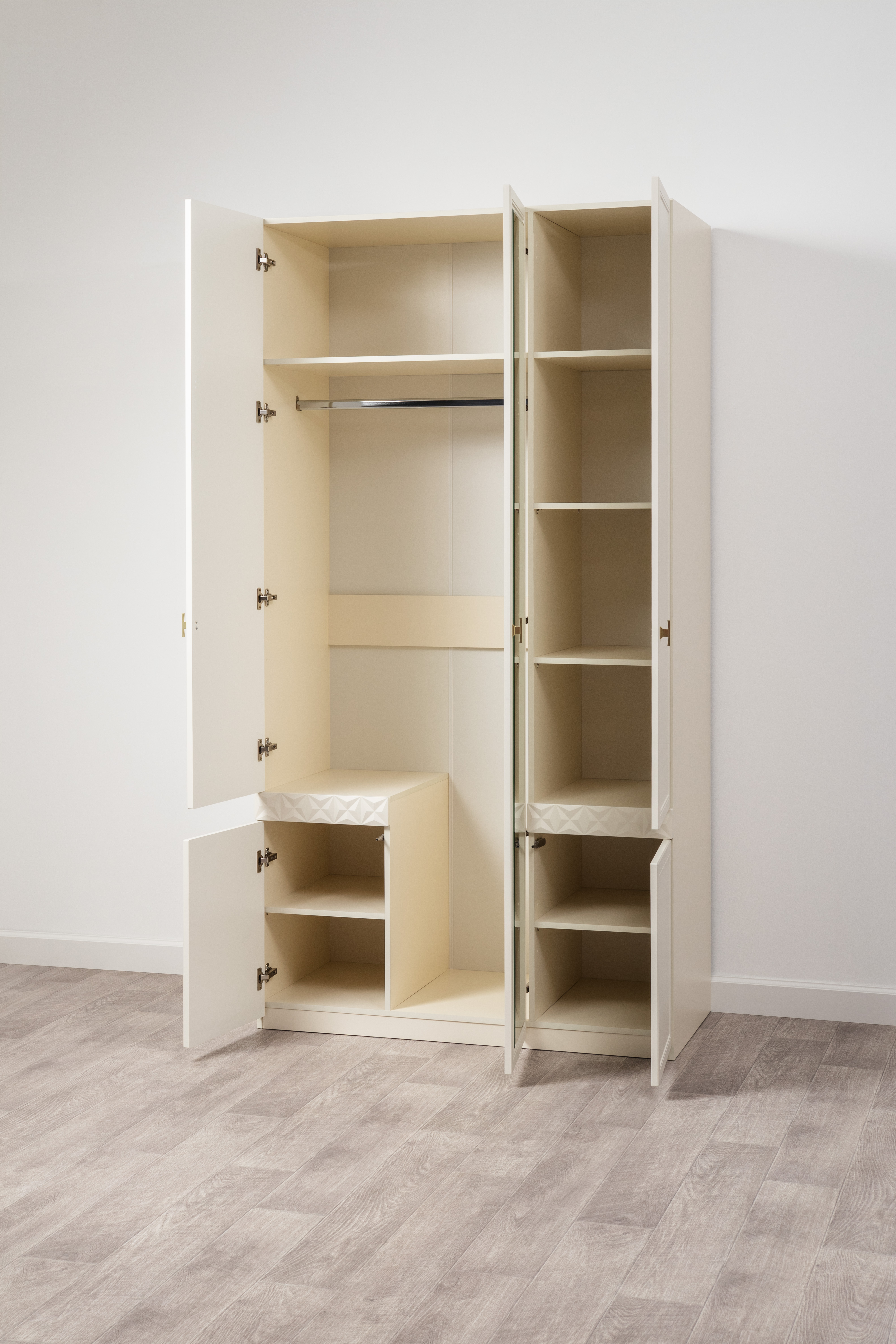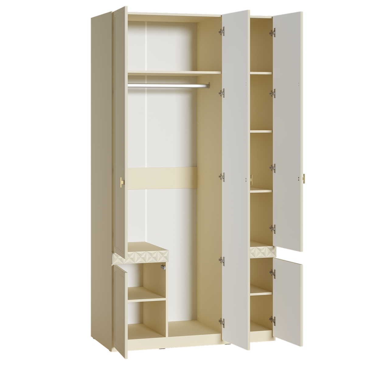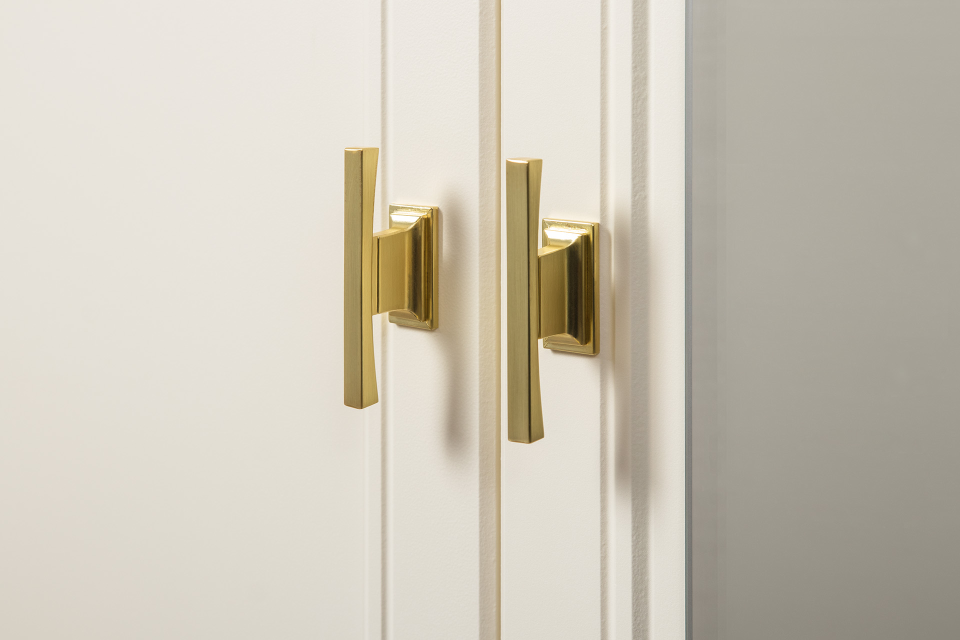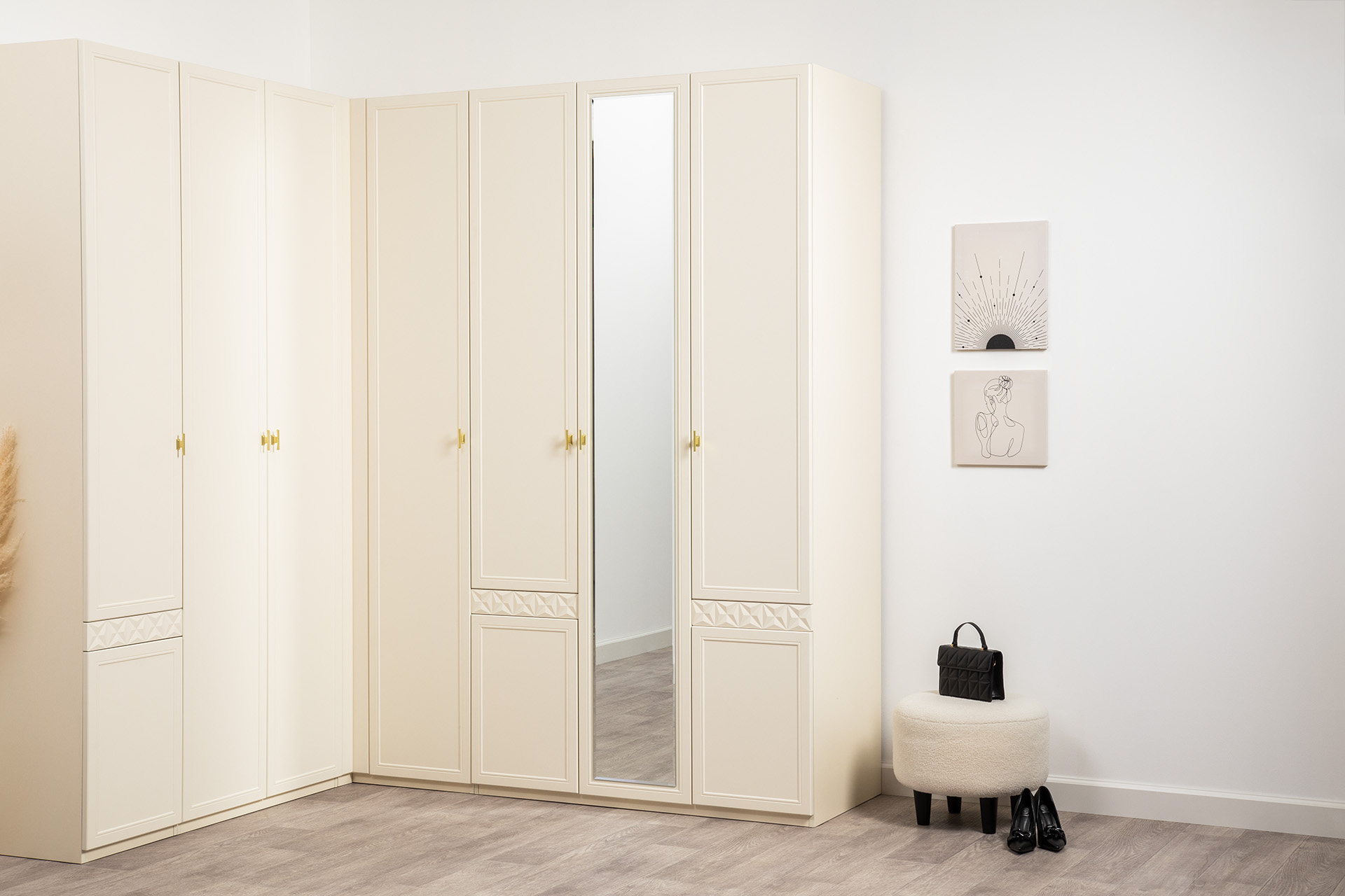 Изящные линии, глубокая фрезеровка фасадов из МДФ и благородные оттенки. Утончённая «Слоновая кость» и изысканная «Олива Шагрень» с глубоким зелёным тоном — создают атмосферу уюта, тепла и благородства. Металлические ручки и опоры золотого цвета придают мебели утончённый блеск, а петли и направляющие с доводчиками обеспечивают плавное и бесшумное закрытие фасадов.