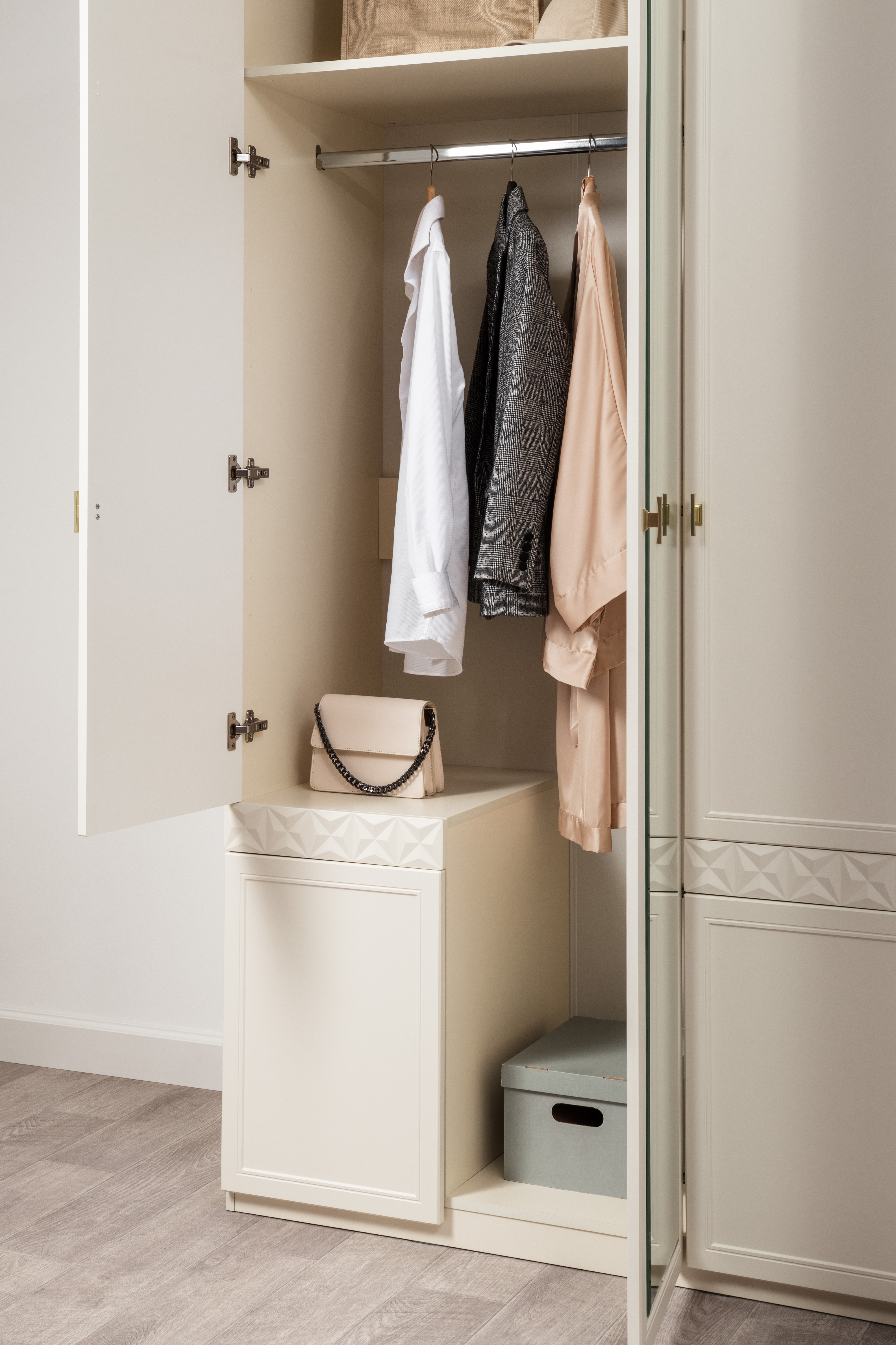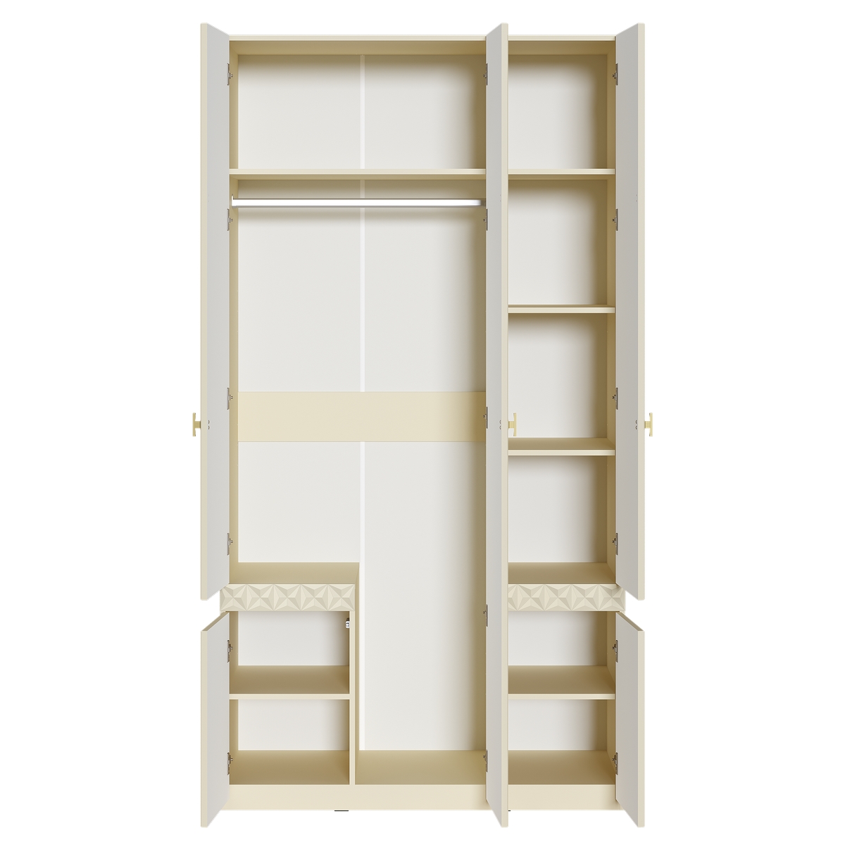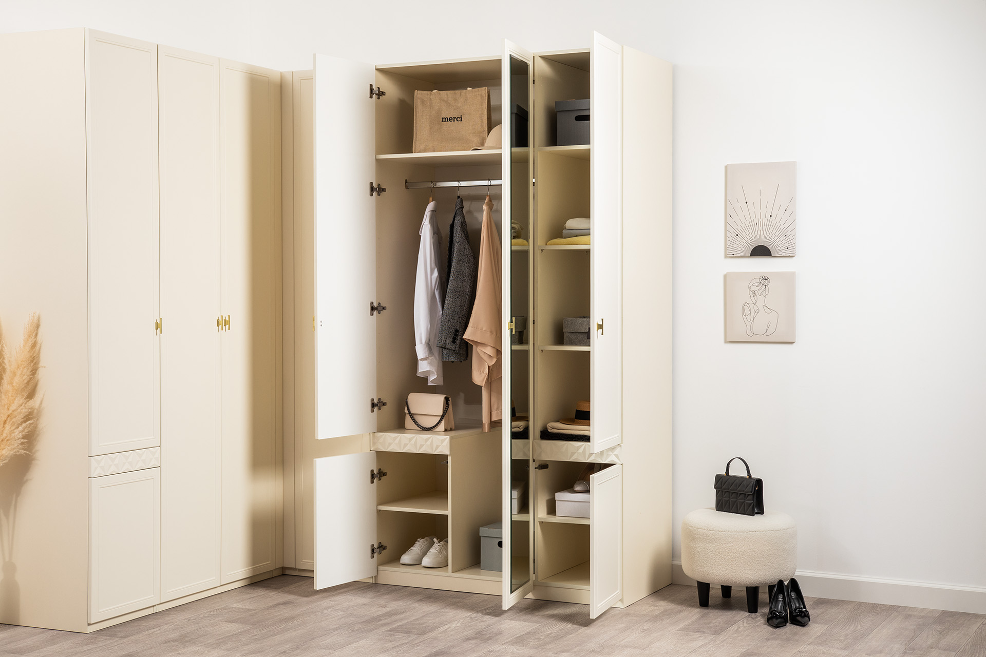 Изящные линии, глубокая фрезеровка фасадов из МДФ и благородные оттенки. Утончённая «Слоновая кость» и изысканная «Олива Шагрень» с глубоким зелёным тоном — создают атмосферу уюта, тепла и благородства. Металлические ручки и опоры золотого цвета придают мебели утончённый блеск, а петли и направляющие с доводчиками обеспечивают плавное и бесшумное закрытие фасадов.