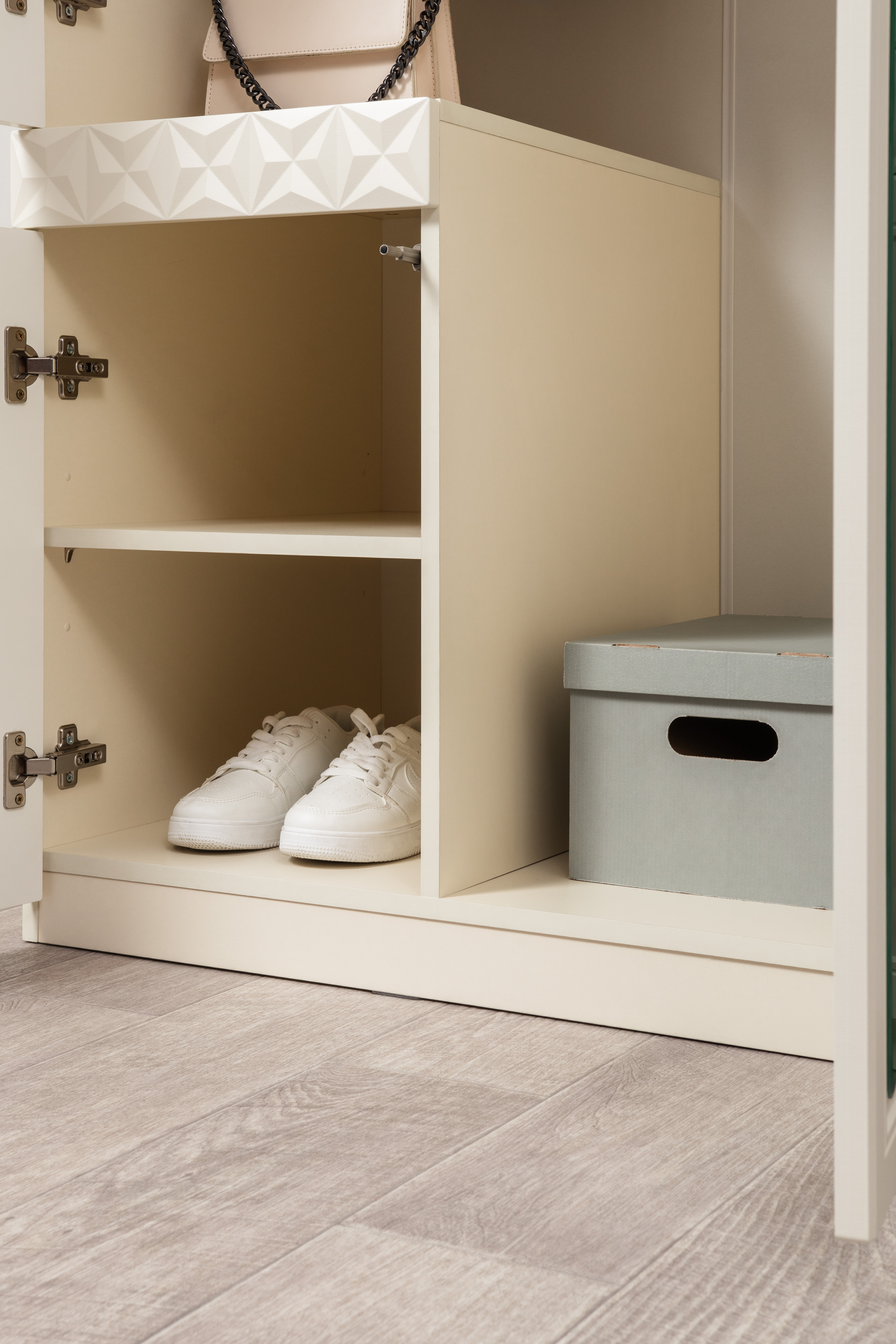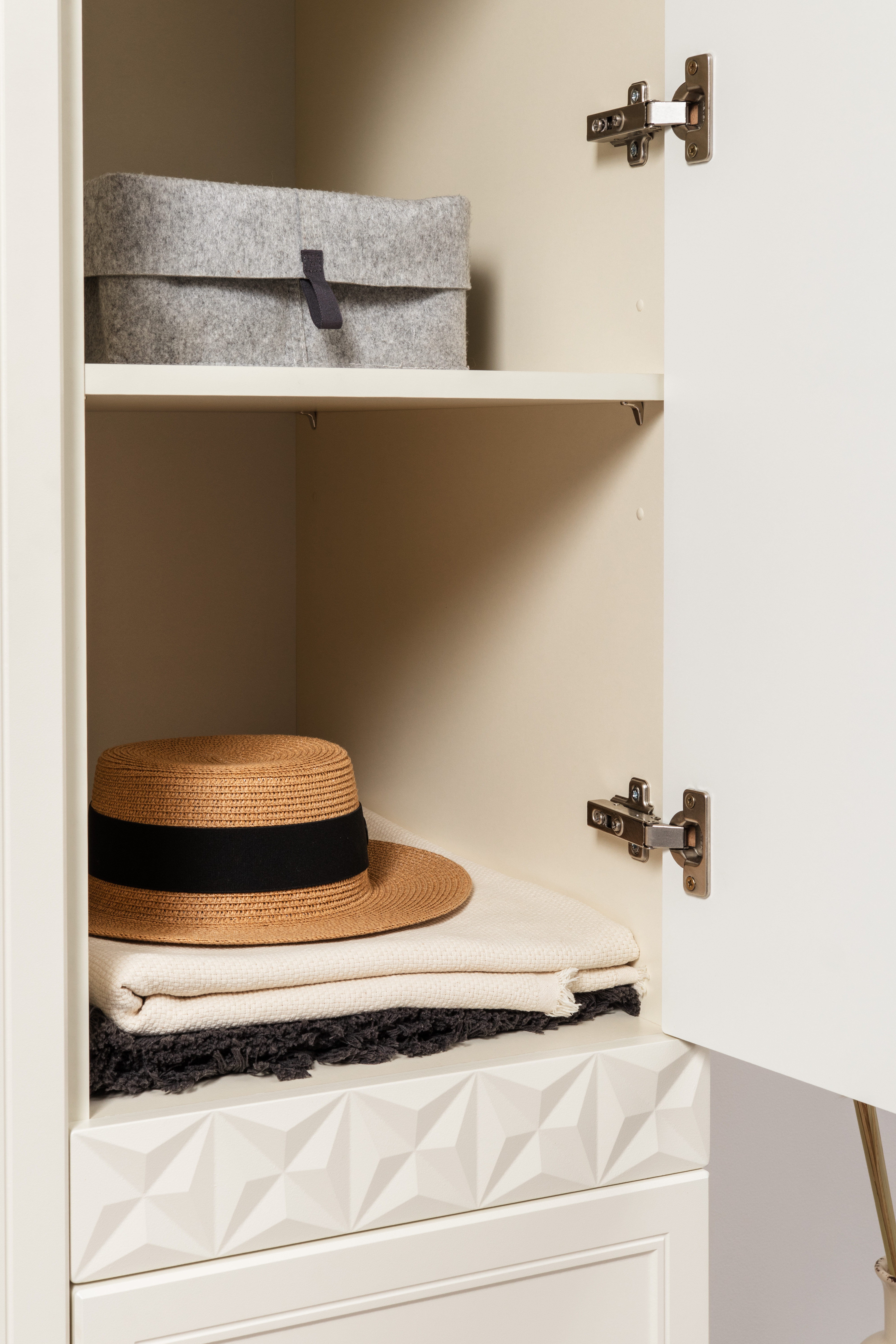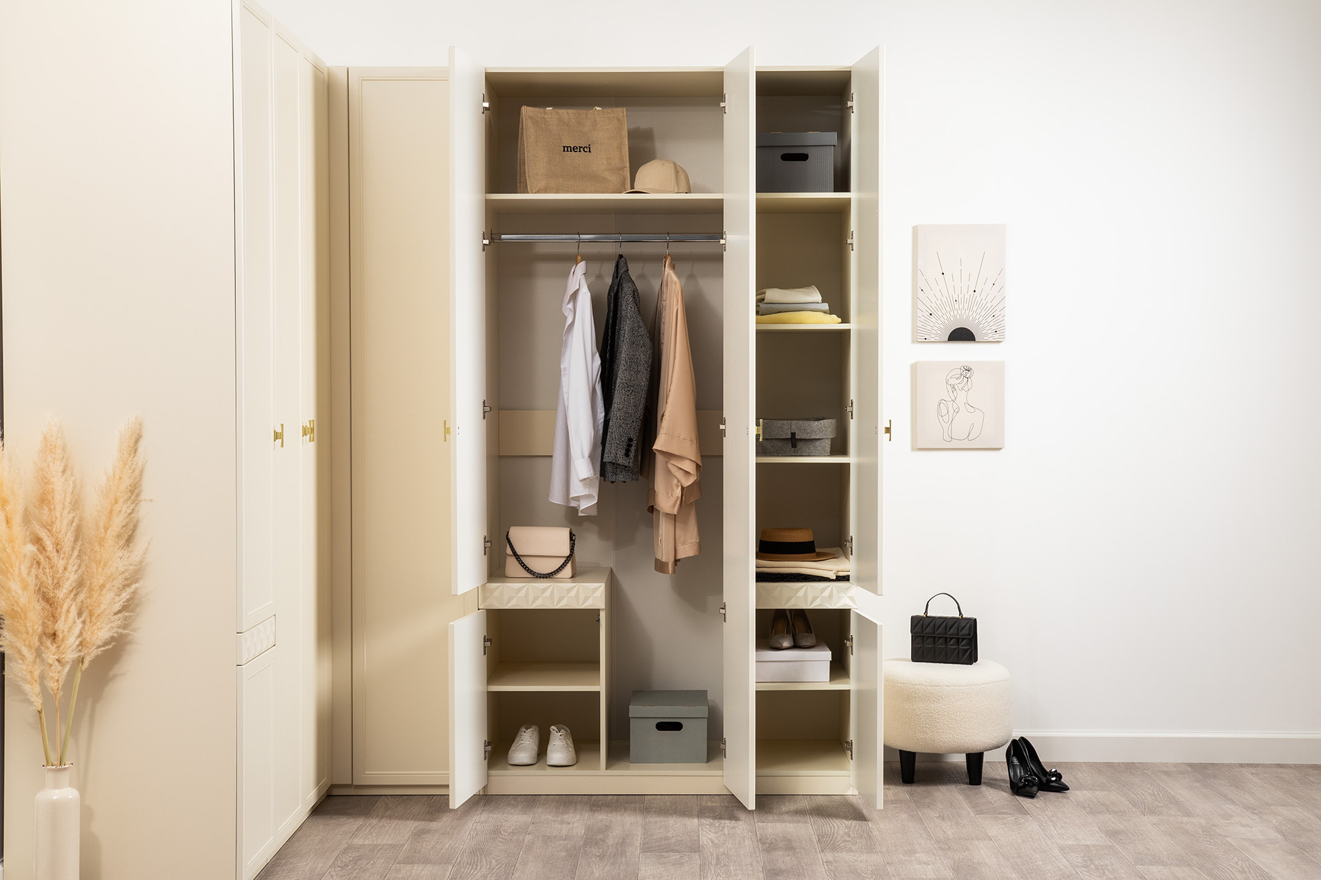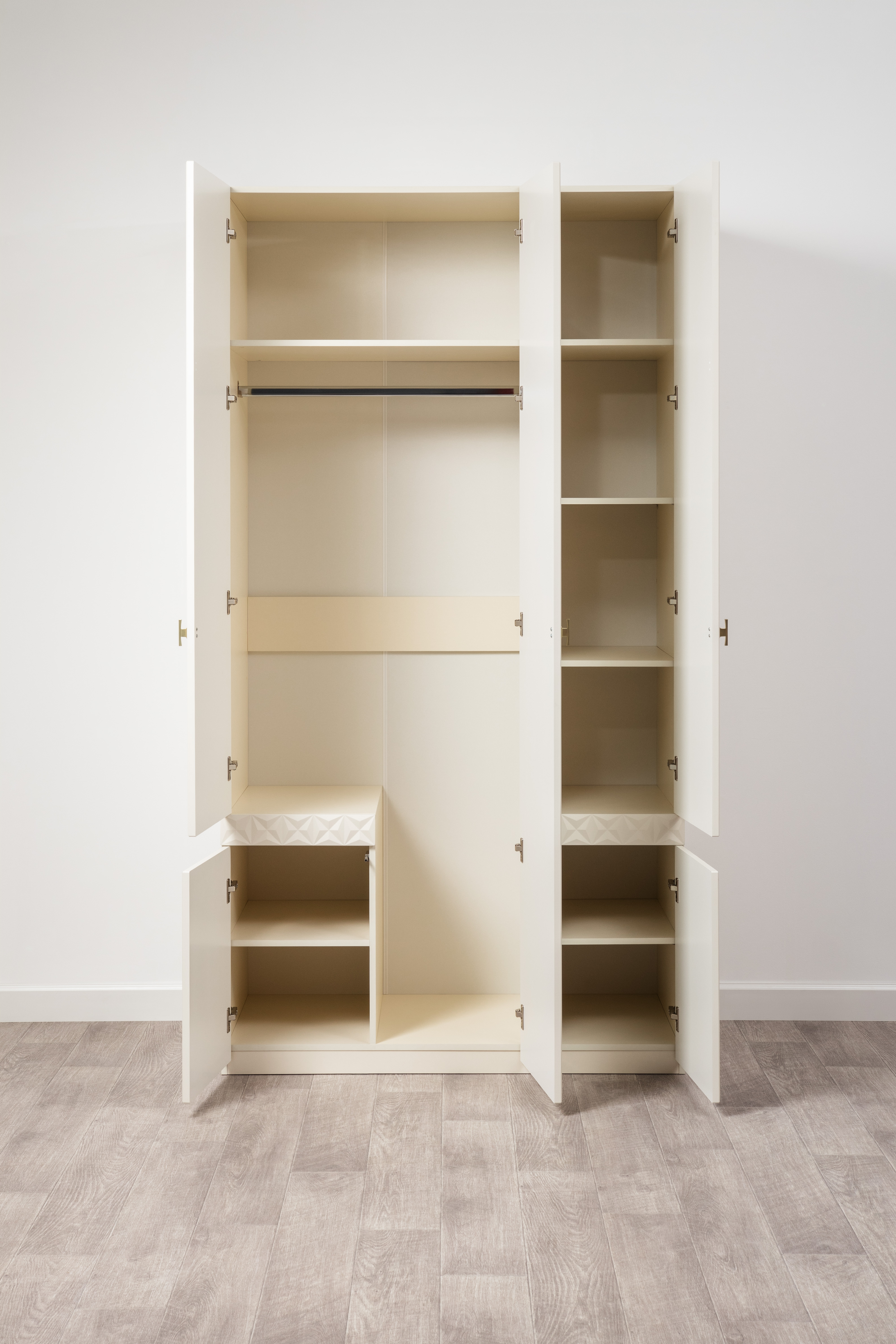 Изящные линии, глубокая фрезеровка фасадов из МДФ и благородные оттенки. Утончённая «Слоновая кость» и изысканная «Олива Шагрень» с глубоким зелёным тоном — создают атмосферу уюта, тепла и благородства. Металлические ручки и опоры золотого цвета придают мебели утончённый блеск, а петли и направляющие с доводчиками обеспечивают плавное и бесшумное закрытие фасадов.