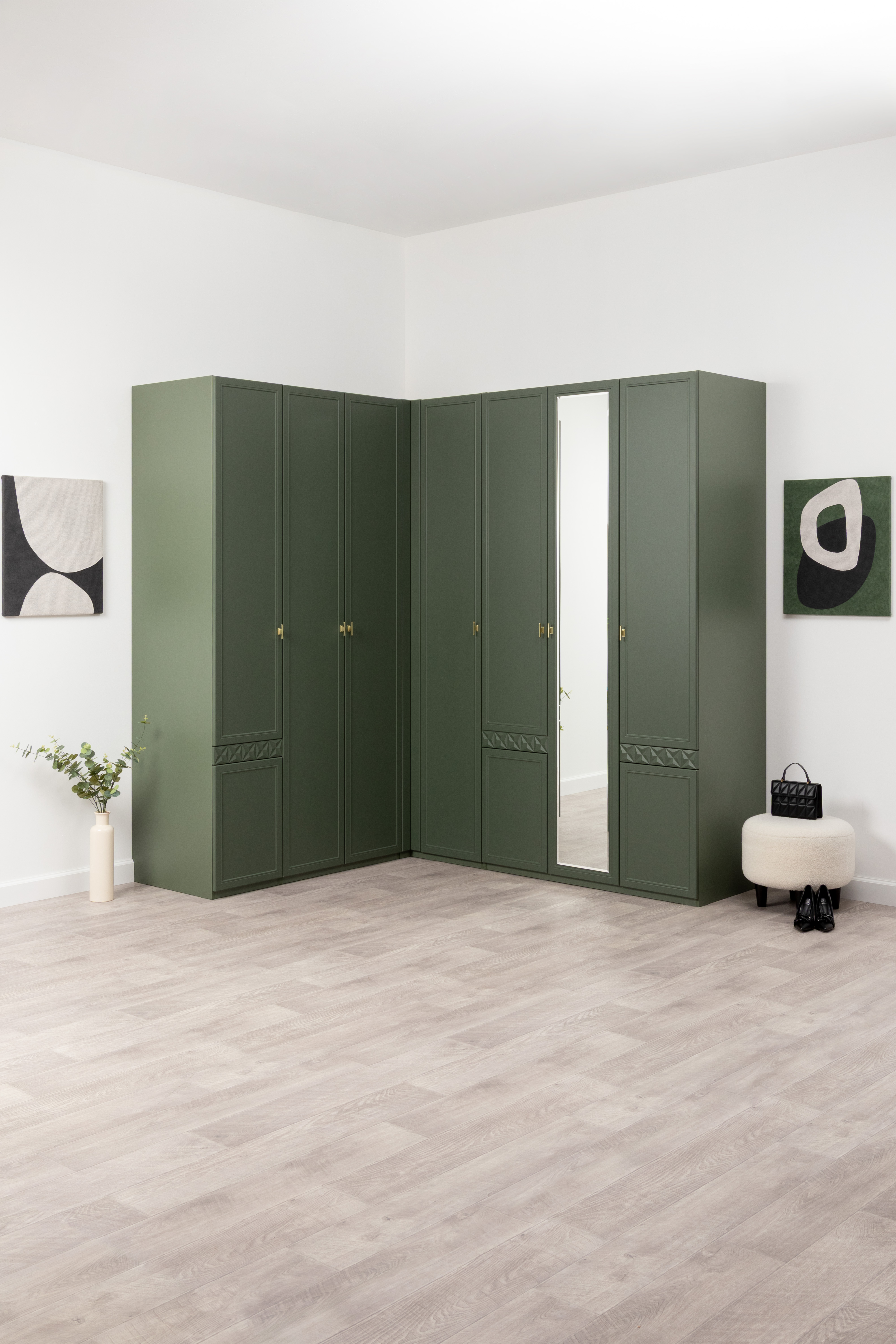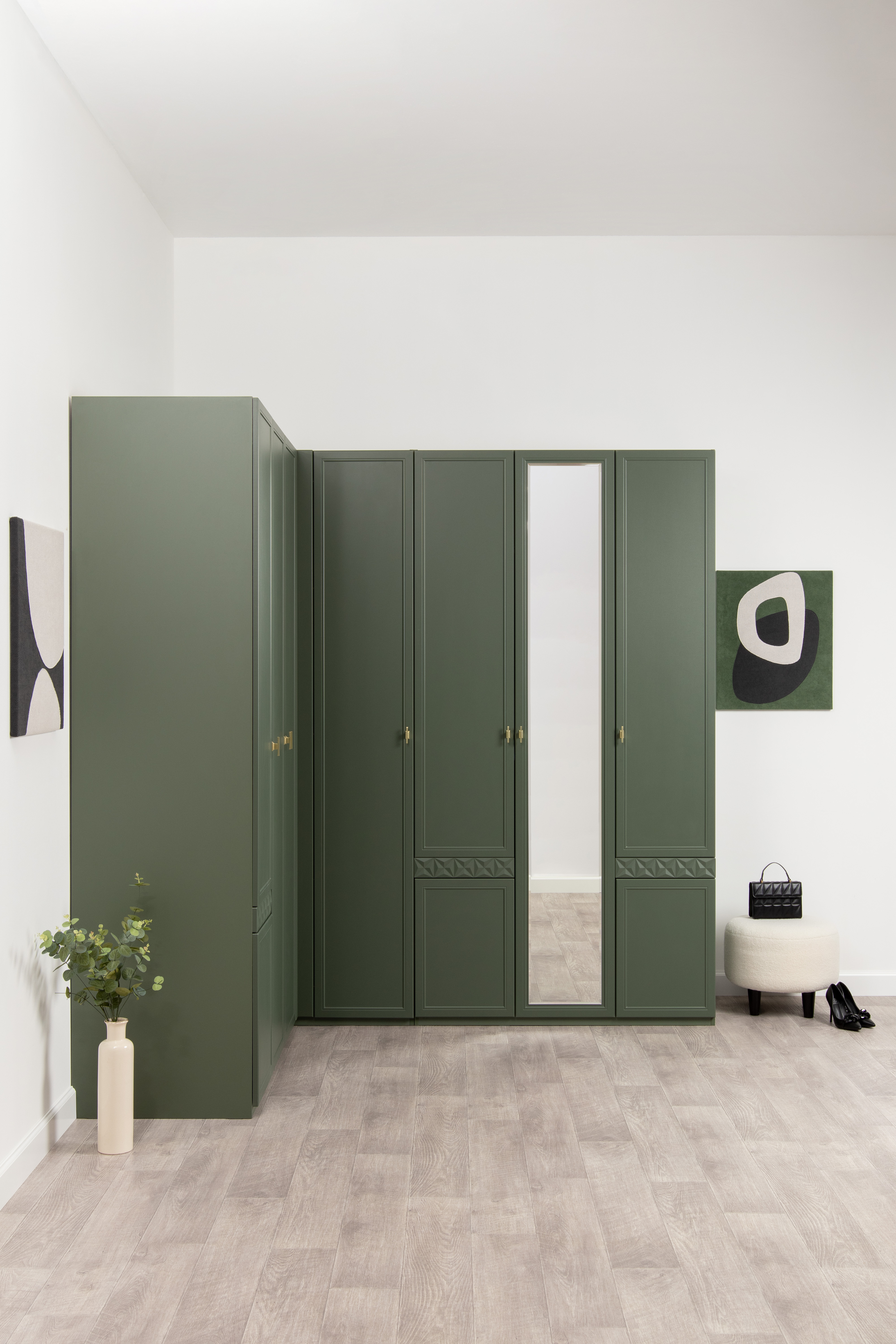 Шкаф угловой Марион 16.339 дымчатый зеленый K521, олива шагрень AG 1050 ПВХ (собирается на любую сторону)