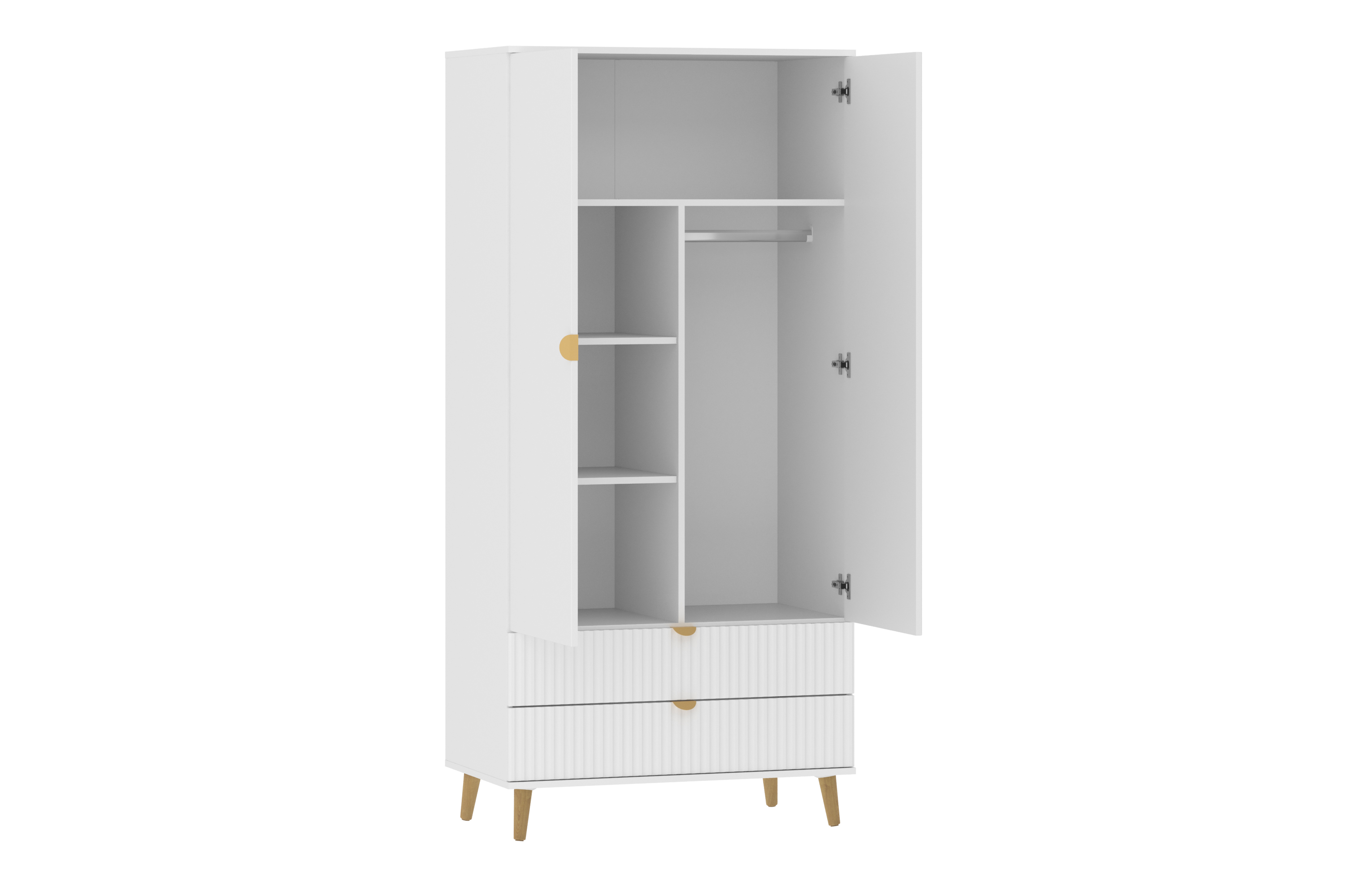 Модульная композиция включает 2 тумбы, оснащенные выдвижными ящиками, которые открываются плавно и бесшумно благодаря шариковым направляющим, комод и шкаф, в котором удобно организовать предметы одежды, при этом высокие опоры облегчают процесс уборки.