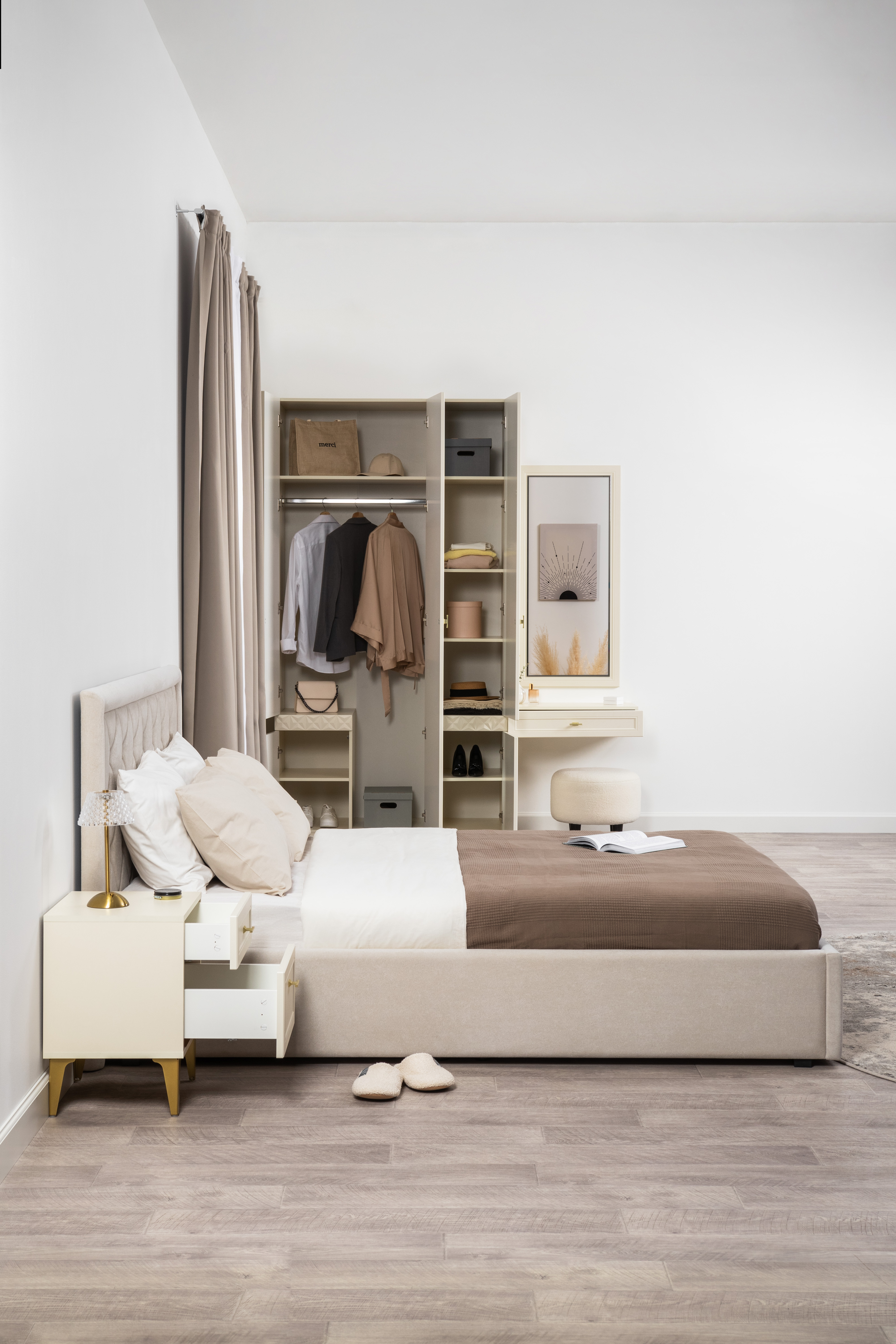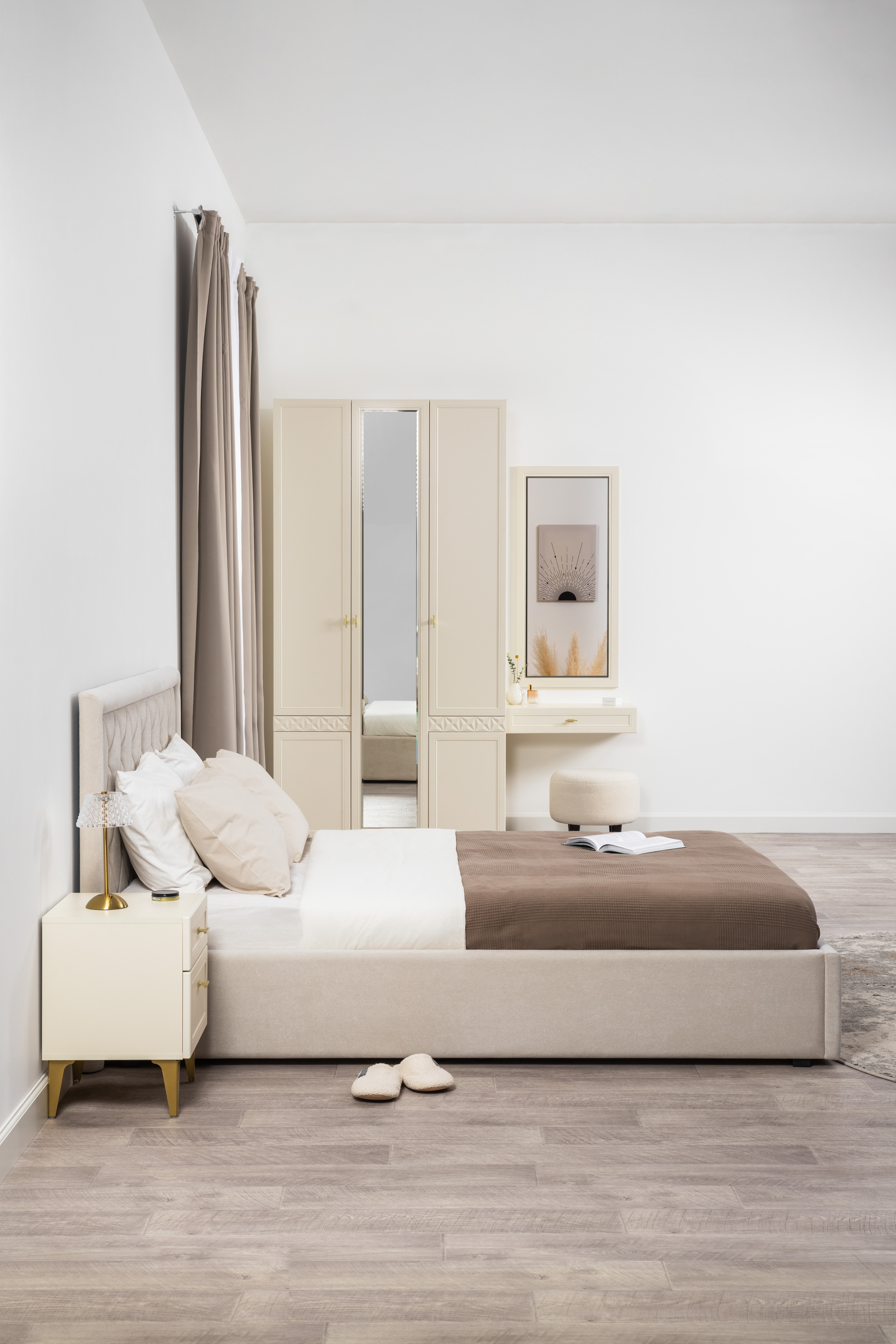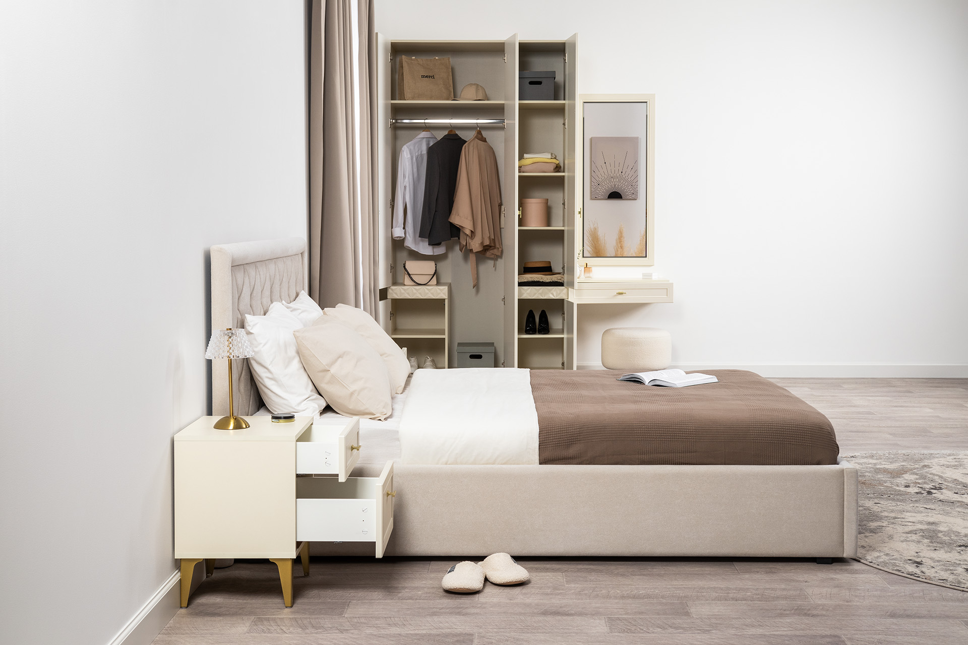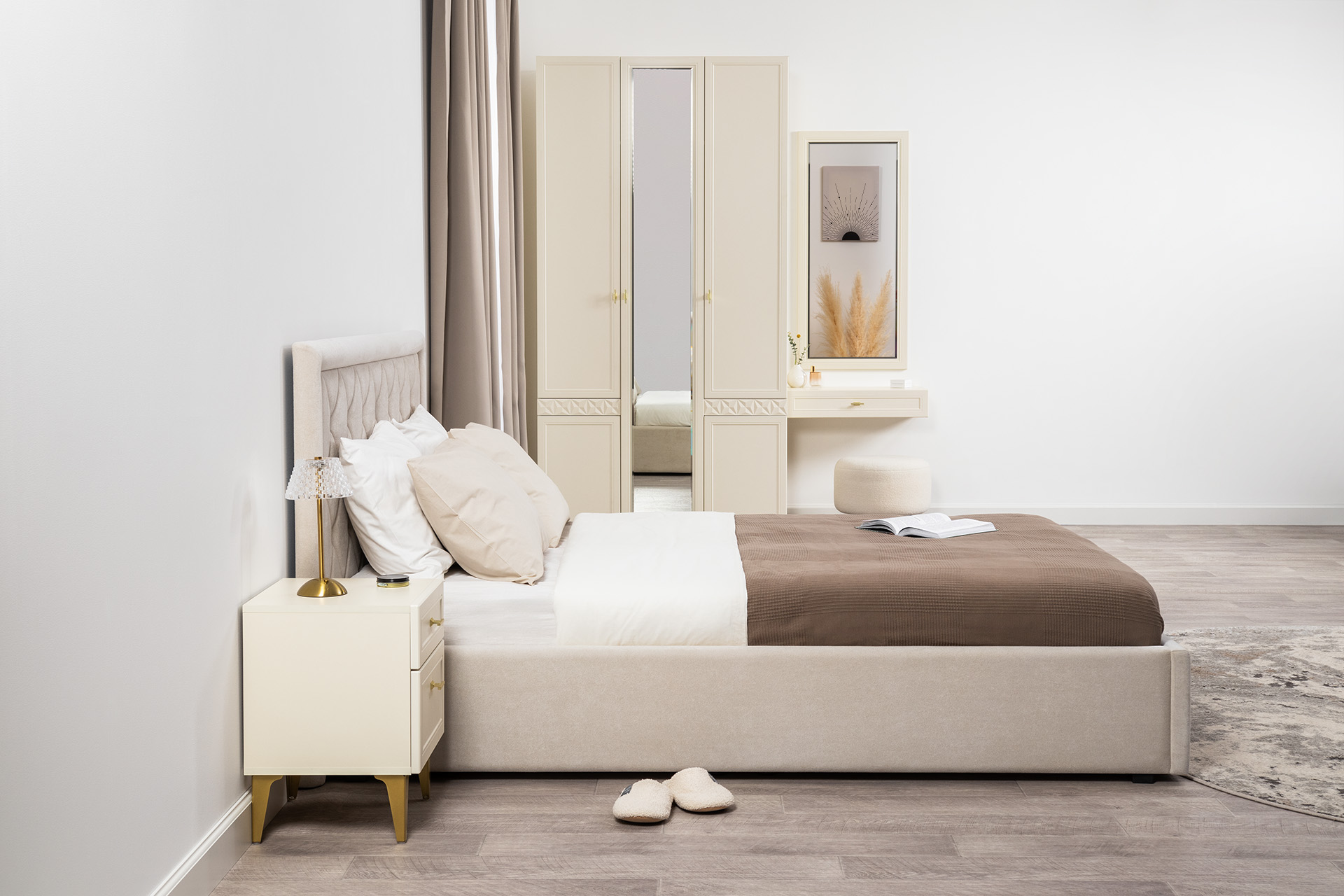 Изящные линии, глубокая фрезеровка фасадов из МДФ и благородные оттенки. Утончённая «Слоновая кость» и изысканная «Олива Шагрень» с глубоким зелёным тоном — создают атмосферу уюта, тепла и благородства. Металлические ручки и опоры золотого цвета придают мебели утончённый блеск, а петли и направляющие с доводчиками обеспечивают плавное и бесшумное закрытие фасадов.