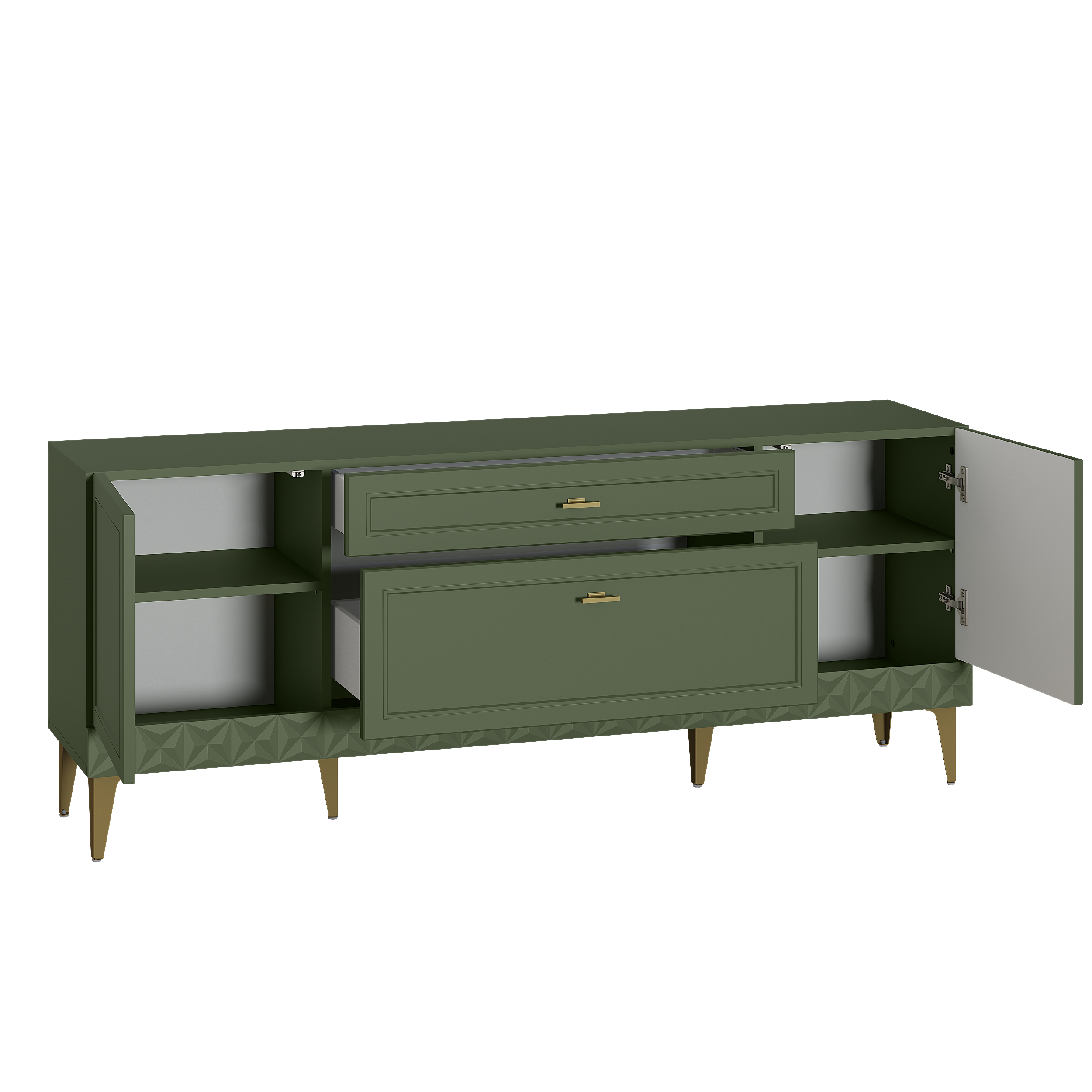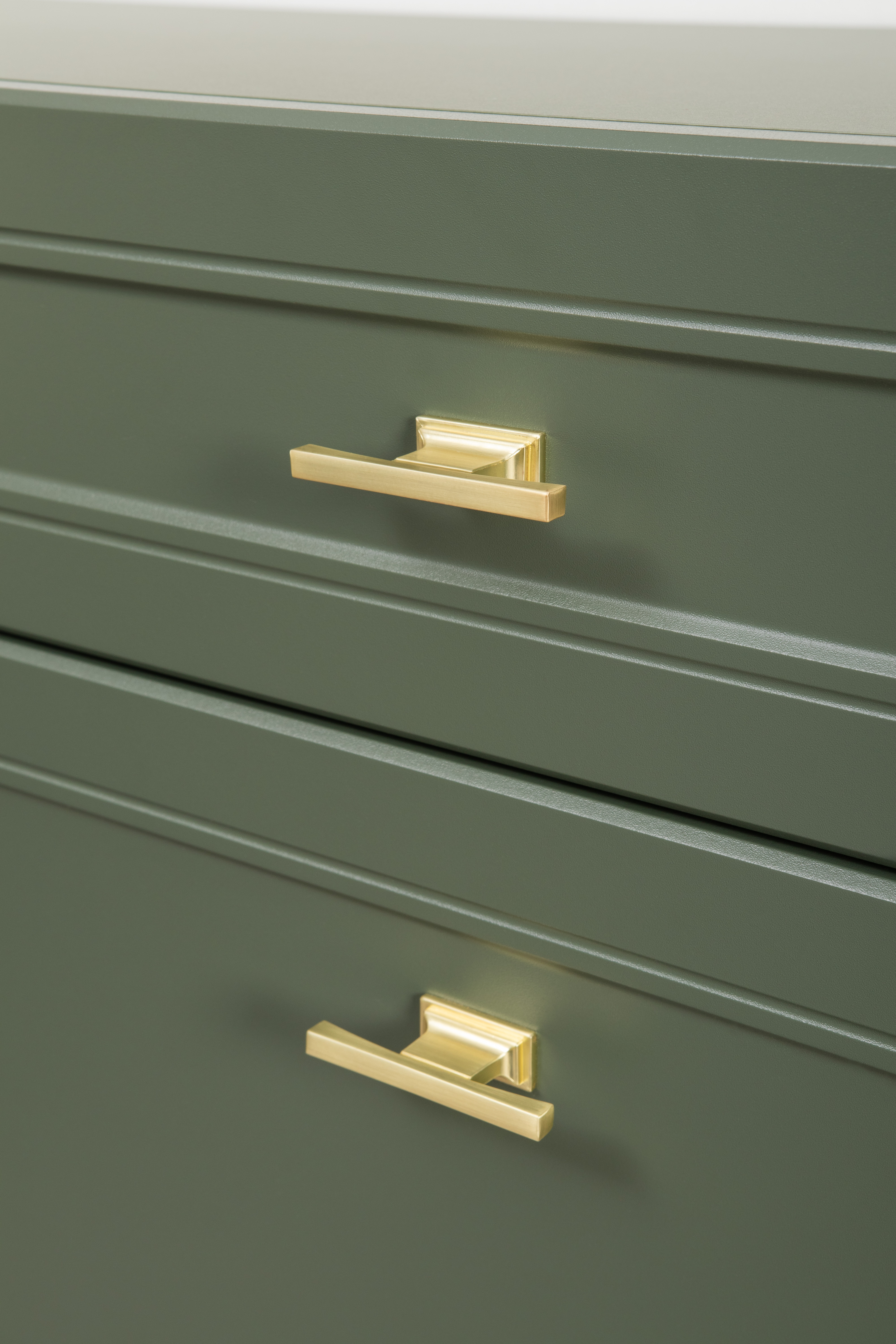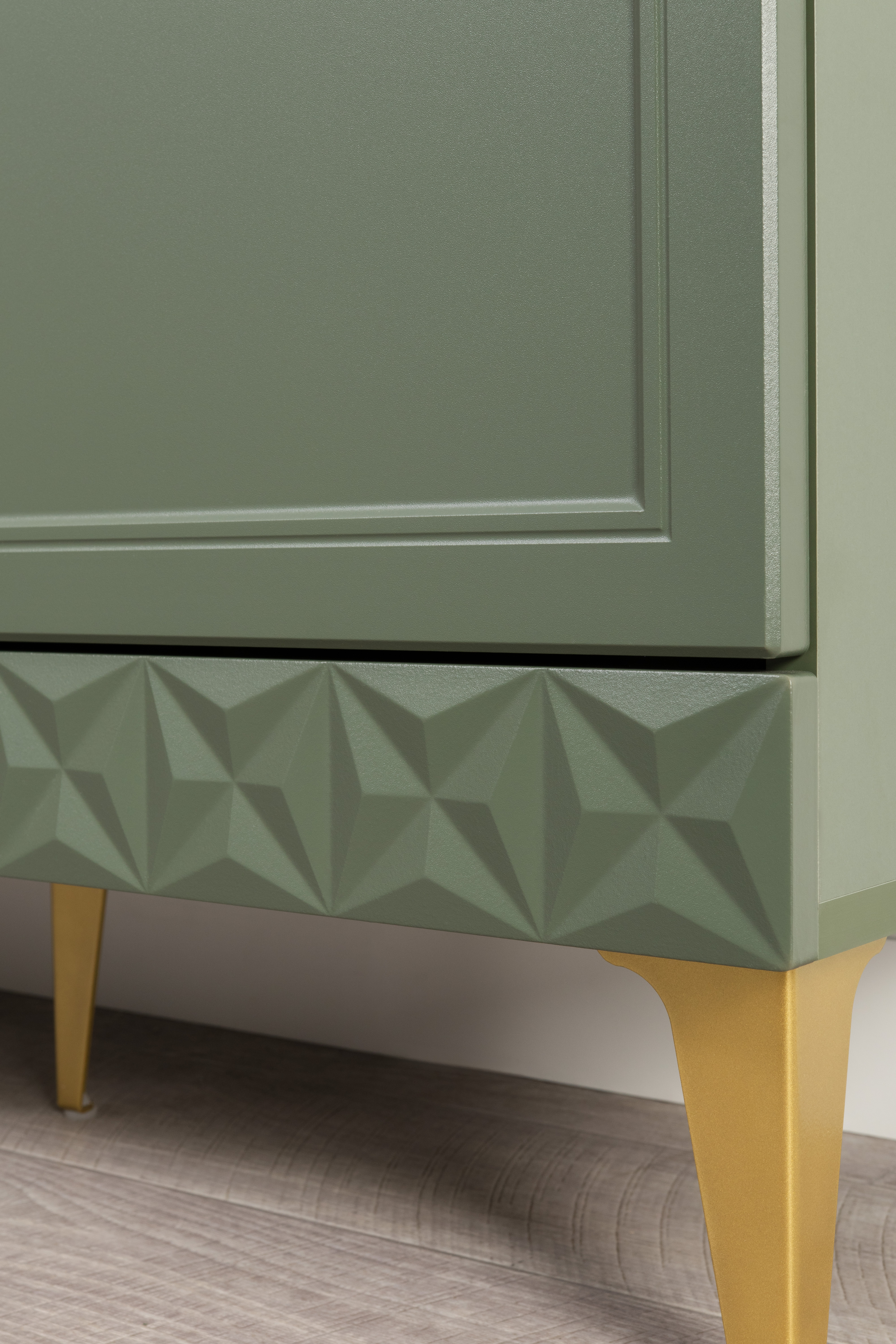 Изящные линии, глубокая фрезеровка фасадов из МДФ и благородные оттенки. Утончённая «Слоновая кость» и изысканная «Олива Шагрень» с глубоким зелёным тоном — создают атмосферу уюта, тепла и благородства. Металлические ручки и опоры золотого цвета придают мебели утончённый блеск, а петли и направляющие с доводчиками обеспечивают плавное и бесшумное закрытие фасадов.